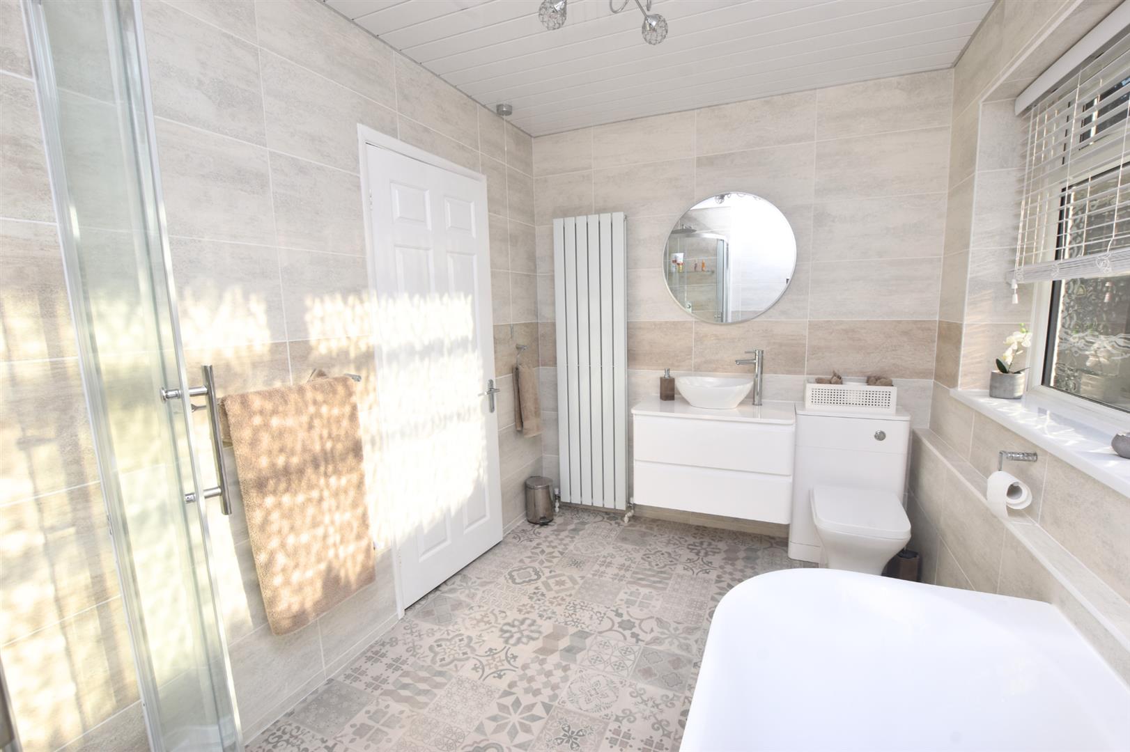 This family bathroom is fitted with a free standing bath having a hand held shower spray, a corner shower cubicle together with a vanity area including a vanity bowl with cupboards below and a concealed wc. Tiled walls, double glazed window. patterned vinyl floor., vertical radiator and uPVC white ceiling.
