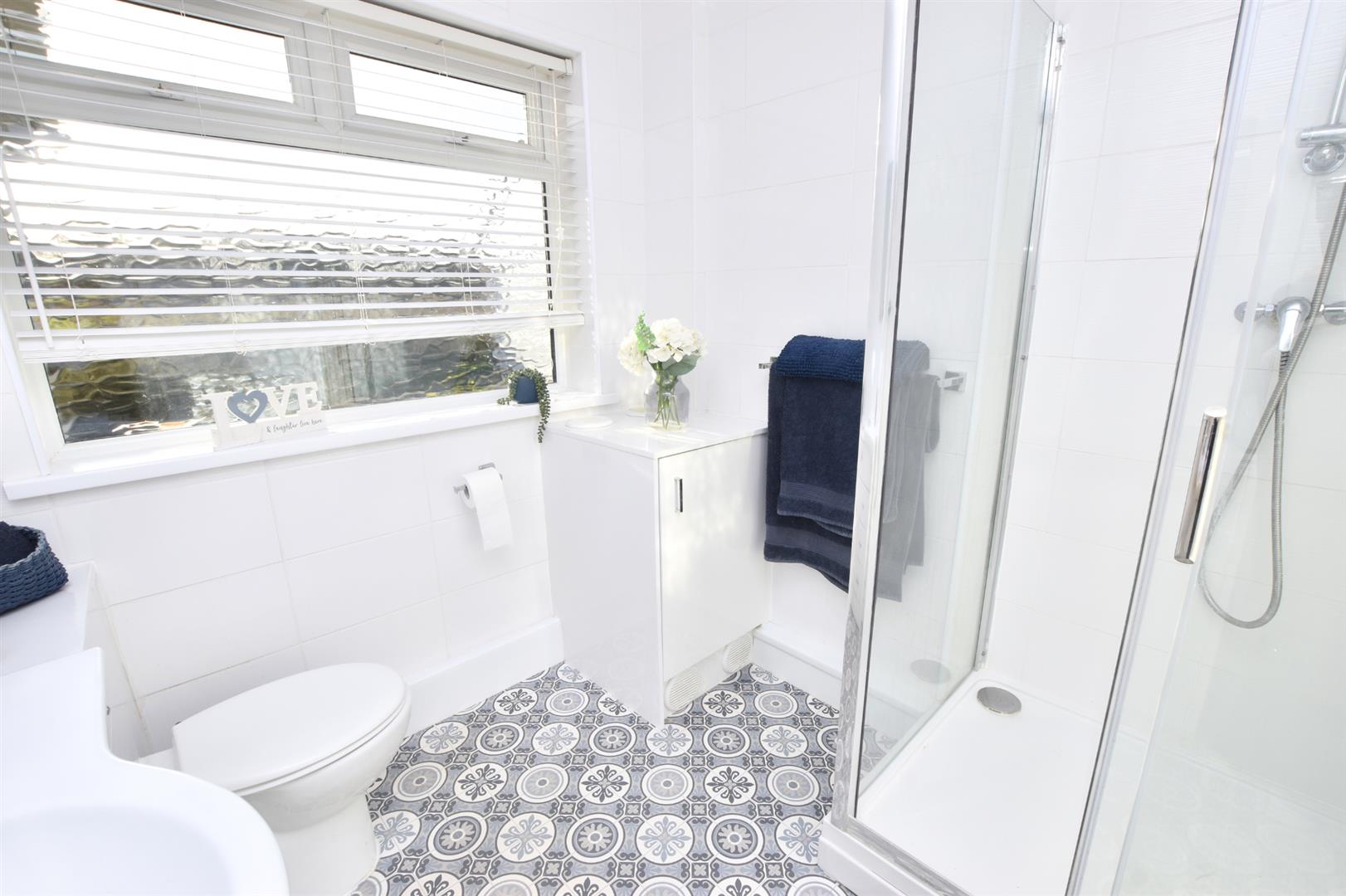 In addition to the main bathroom is this useful separate shower room which includes a corner shower cubicle and a vanity unit incorporating a semi recessed sink with cupboards below and a concealed wc. Tiled walls. Vinyl flooring. Double glazed window. Radiator. The Glow Worm gas fired boiler is concealed within a white cupboard. uPVC ceiling.