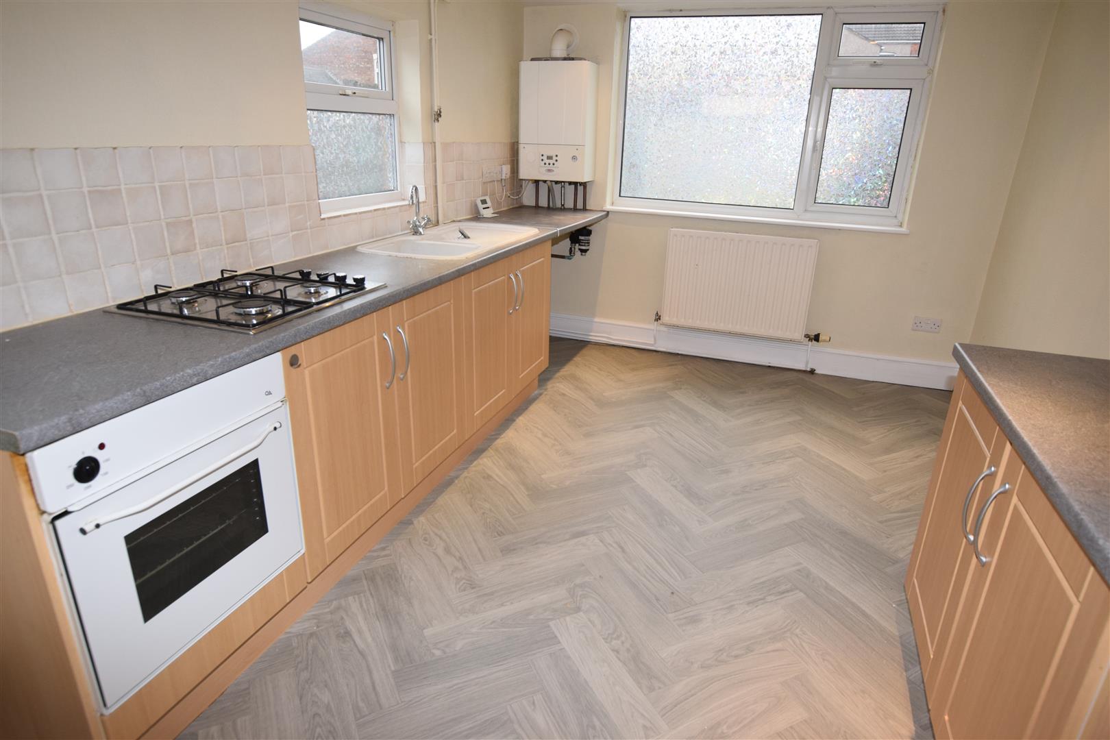 With Beech coloured wall and base units in a Shaker style finish with work surfacing incorporating the 1.5 bowl sink unit with mixer tap. Space and plumbing for automatic washing machine. Ceramic tiling to splash back areas. Built in electric oven and 4 ring gas hob. Recess lighting to ceiling. Wall mounted gas central heating boiler. Double glazed windows and door to rear.