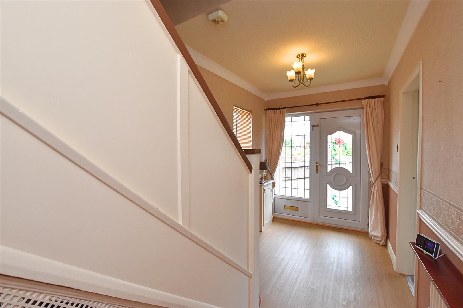 Approached via a uPVC door with a double glazed side lights, this spacious entrance hall has a double glazed window to the side elevation, radiator, coving to ceiling together with a fitted dado rail, The floor is finished with a oak style vinyl floor with the staircase leading up to the first floor which has a useful understairs storage cupboard which houses the modern gas fired boiler