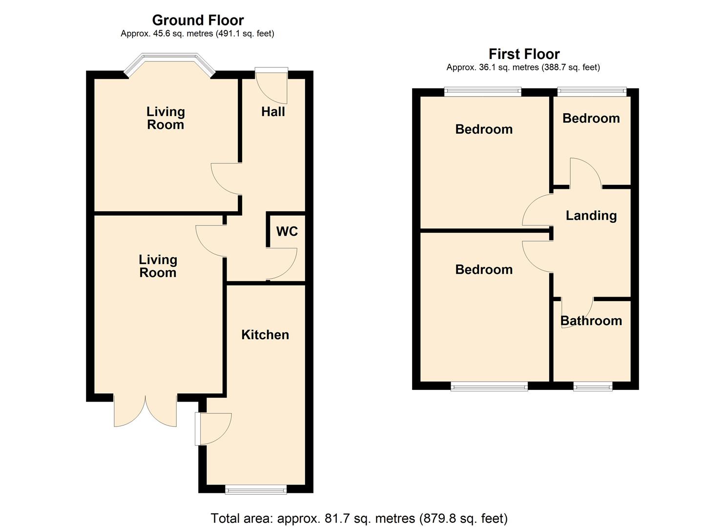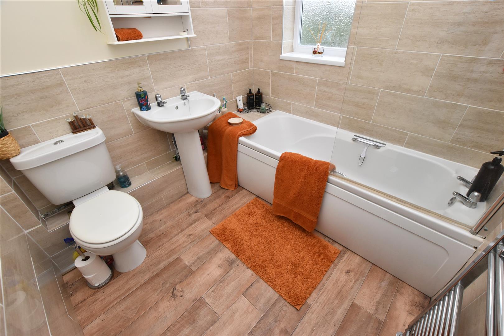 Benefitting from a white three piece suite comprising of; Bath with electric shower over and glazed screen, pedestal hand wash basin and low flush wc. Finished with modern tiling to part of the walls, heated towel rails, wood effect vinyl flooring and a uPVC double glazed window to the rear aspect. Loft access to the ceiling.