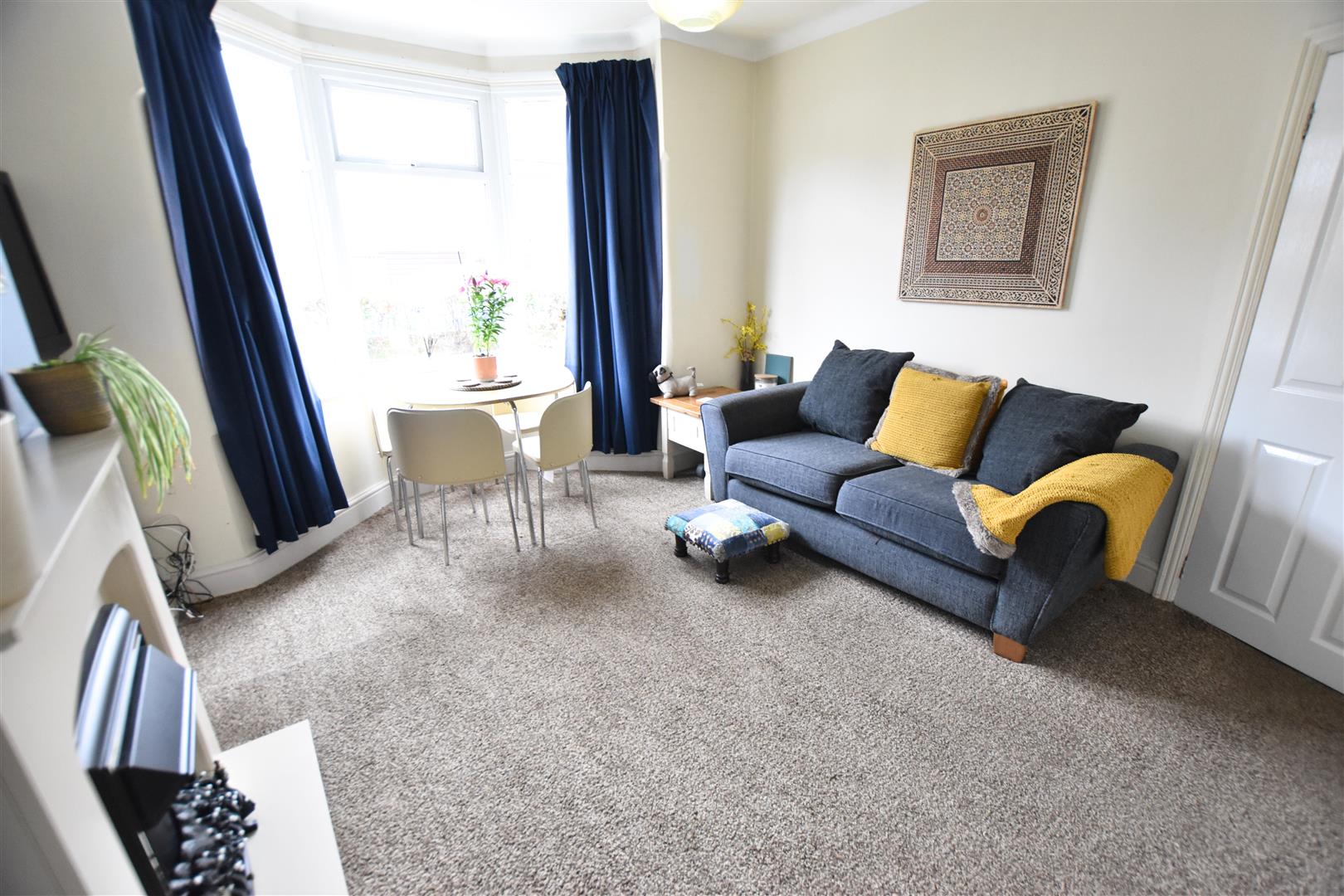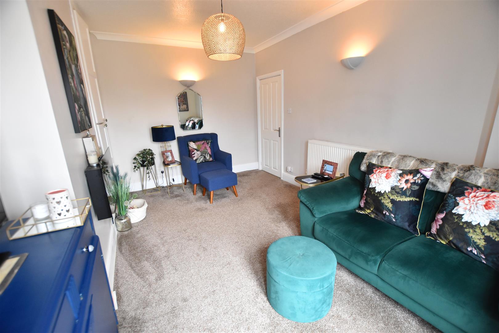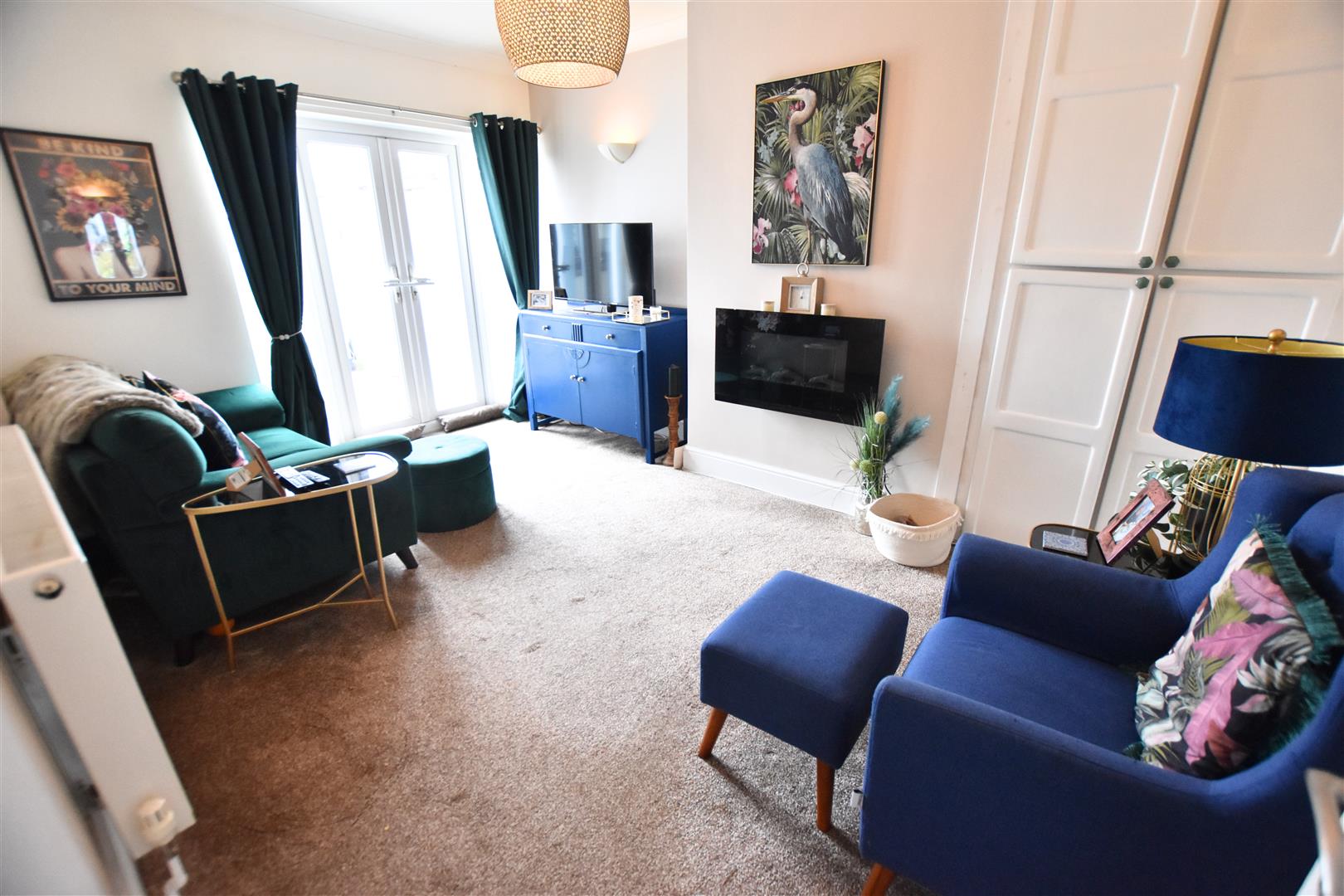 The rear sitting room has a uPVC double glazed French doors to the rear aspect with sidelight panels, coving to the ceiling, carpeted flooring, radiator and original built in storage cupboard.
