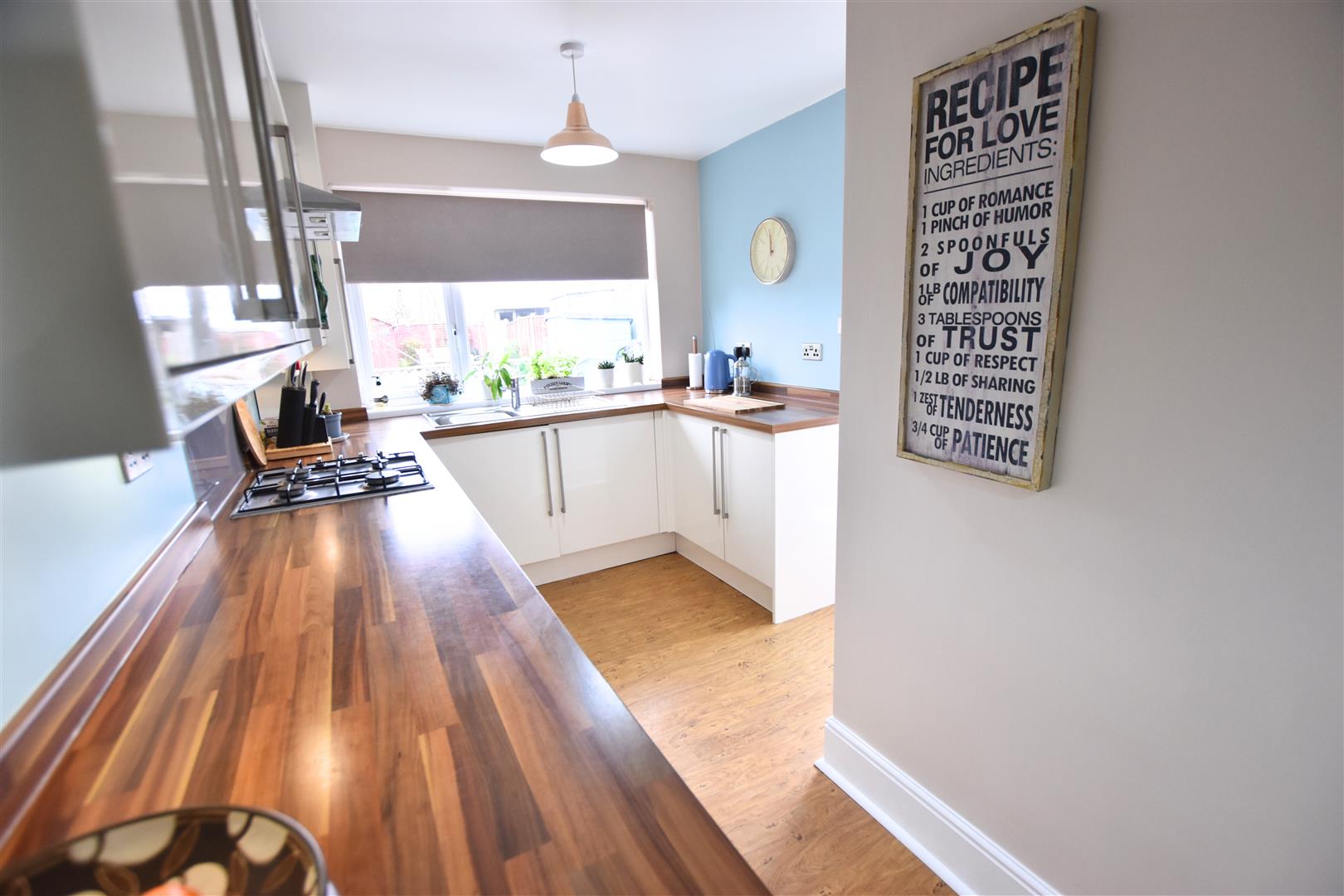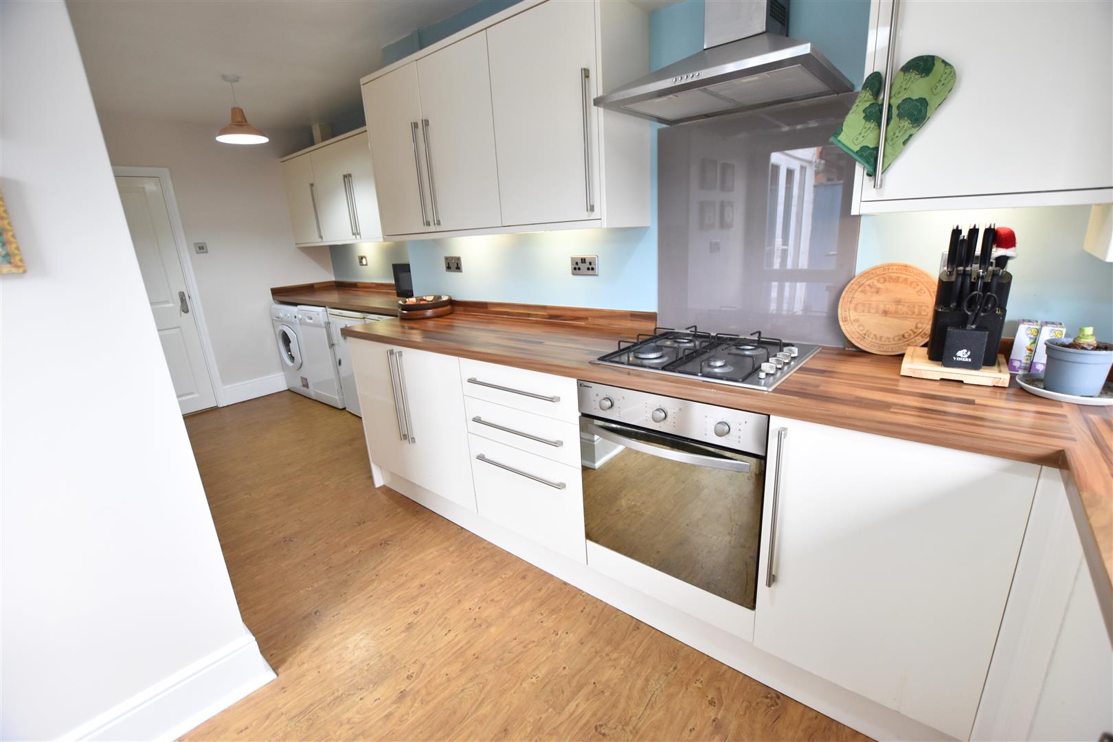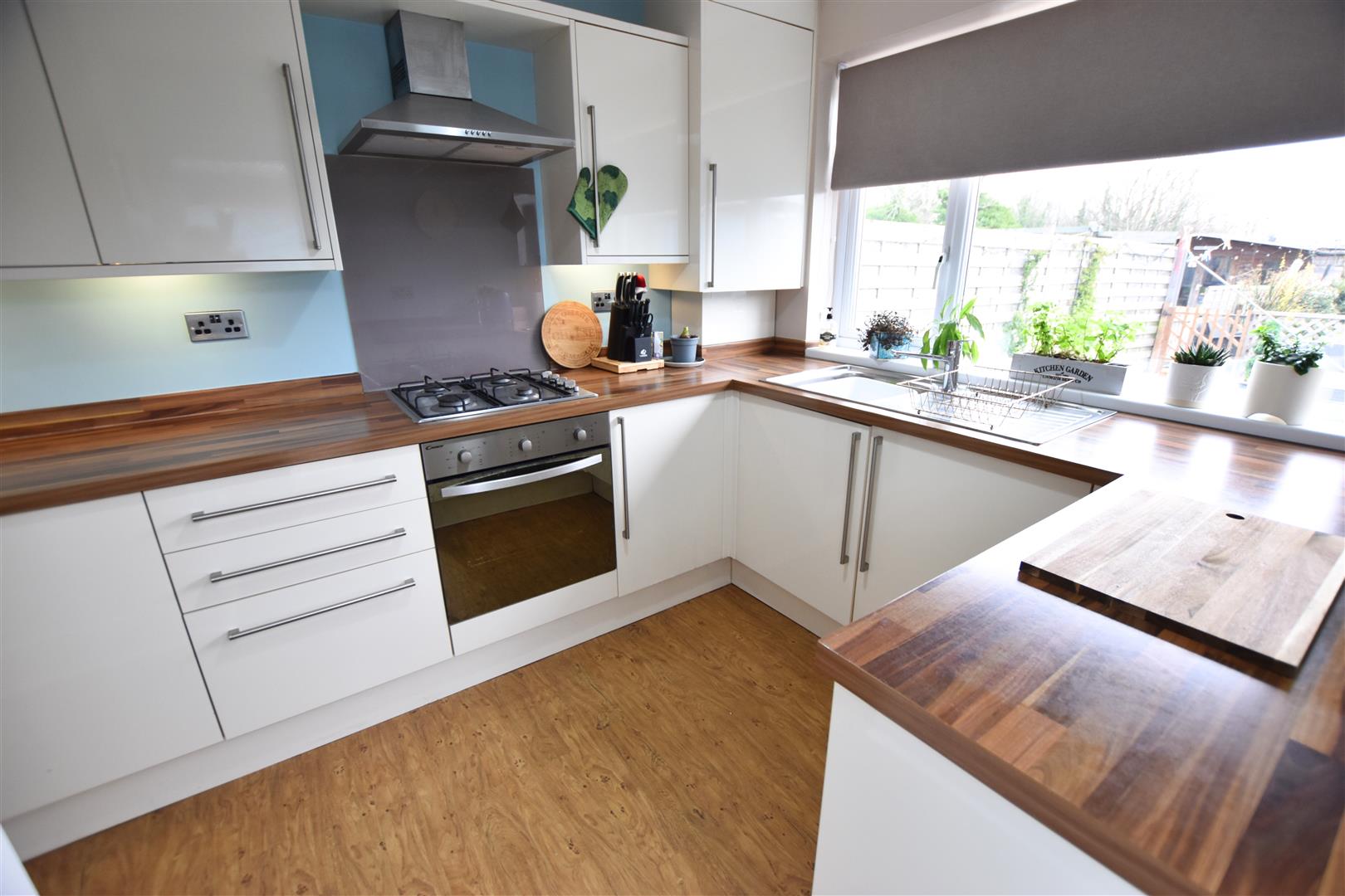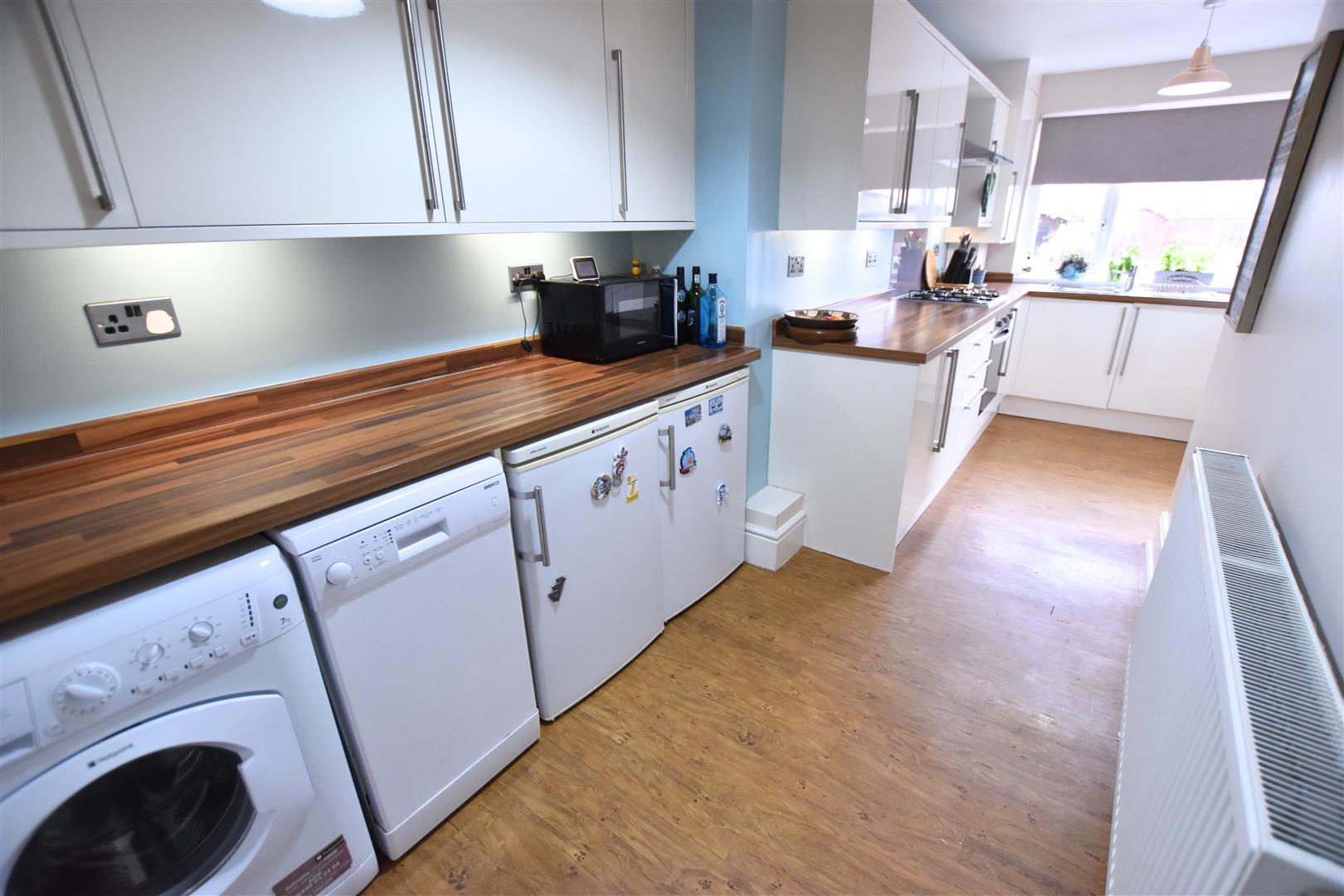 The modern kitchen benefits from a large range of cream gloss wall and base units with contrasting wood effect work surfaces and matching up stands incorporating a stainless steel sink and drainer, gas hob with glass splashback, stainless steel chimney style extractor hood and electric fan assisted oven beneath, ample space for all further appliances. Finished with wall mounted boiler housed in matching unit, wood effect laminate flooring, radiator, uPVC double glazed window to the rear aspect and uPVC double glazed door leading to the garden.