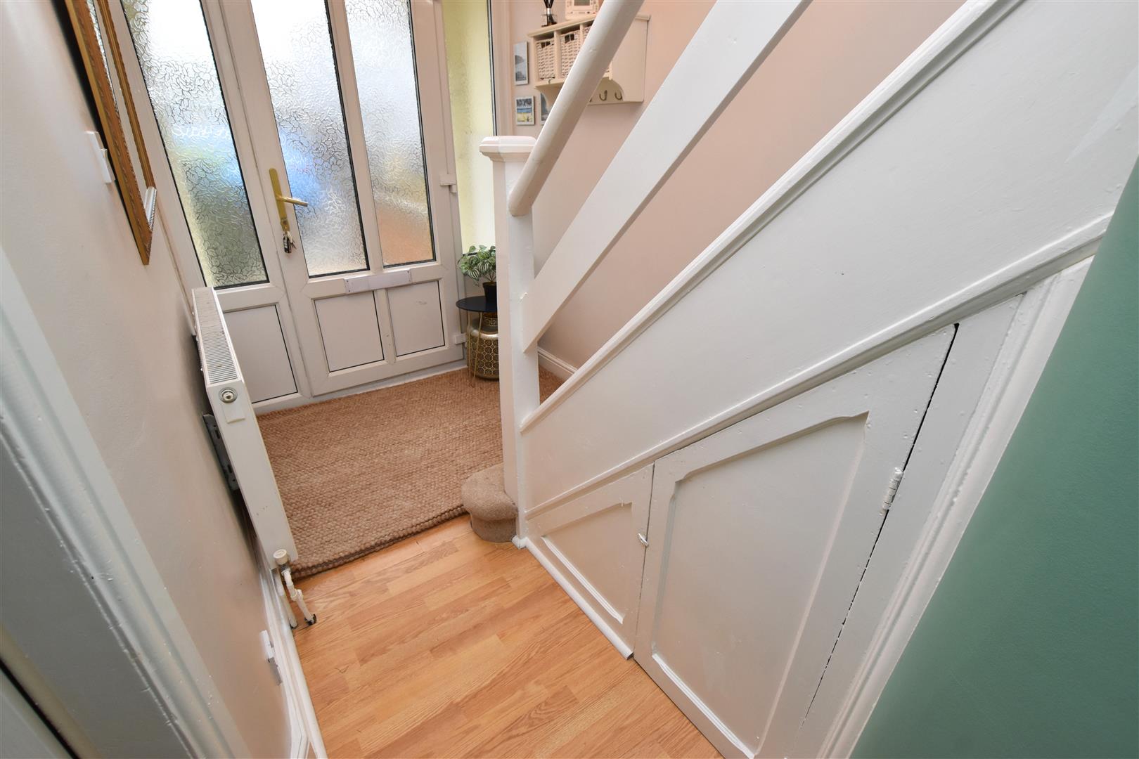 The welcoming hallway has wood effect laminate flooring, coving to the ceiling, radiator and carpeted stairs with slatted bannister leading to the first floor with hand storage.