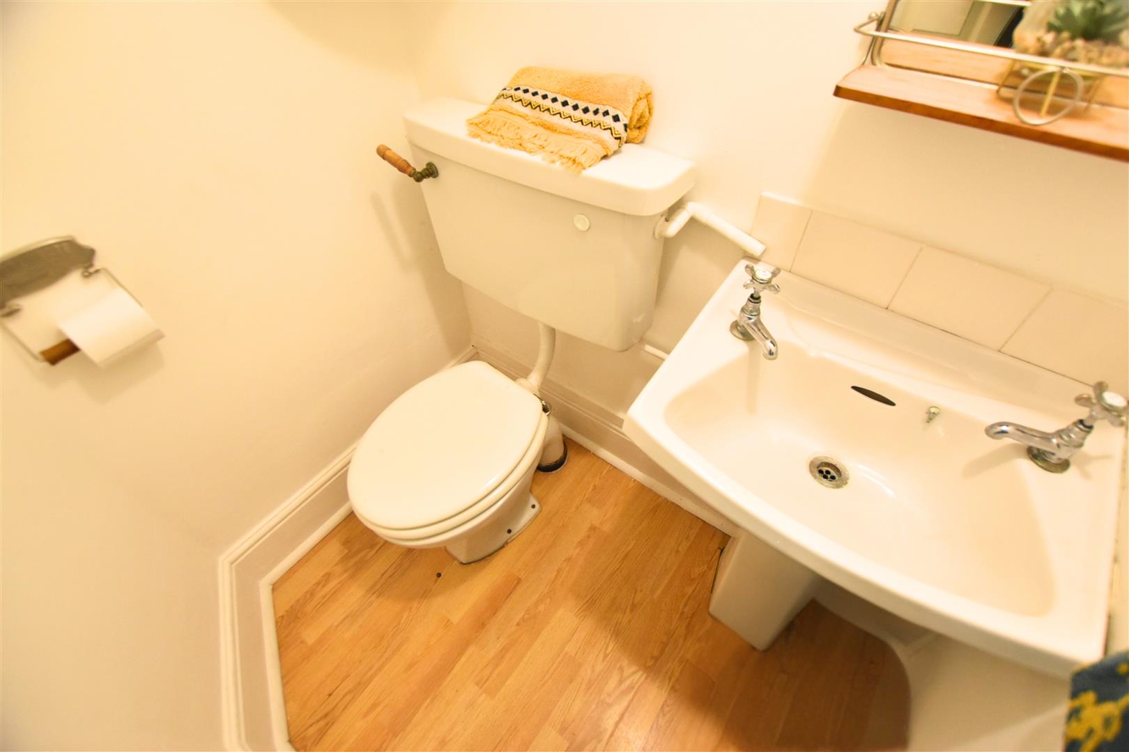 The handy cloakroom benefits from a white two piece suite comprising of; low flush wc and pedestal hand wash basin with tiled splashback and wood effect laminate flooring.