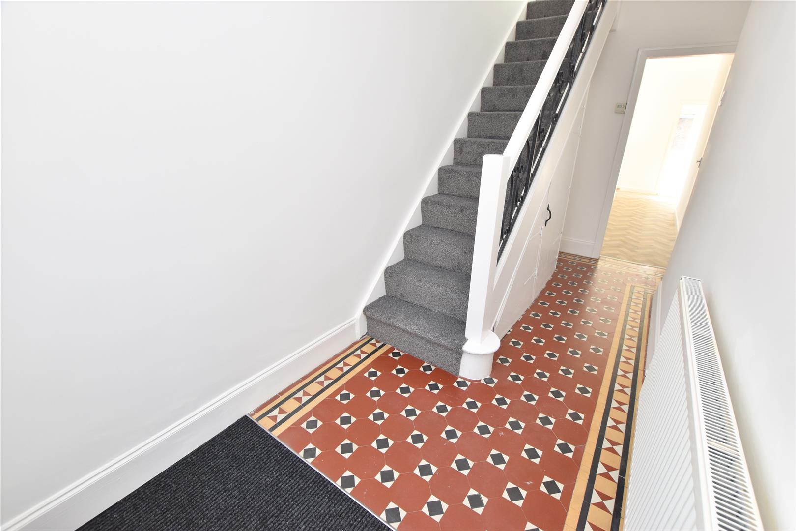 The welcoming hallway retains the original tiled floor with newly fitted entrance door mat, coving to the ceiling and newly carpeted stairs leading to the first floor with decorative balustrade, having the benefit from ample fitted storage beneath.