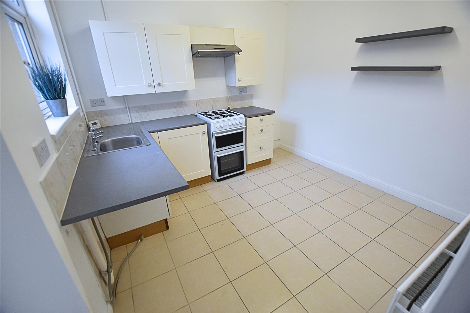 The kitchen benefits from a range of cream fronted wall and base units with contrasting work surfaces and tiled splashbacks incorporating a stainless steel sink and drainer, gas oven and hob and ample space for a freestanding fridge freezer and automatic washing machine. Finished with tiled flooring, radiator, uPVC double glazed window to the aspect and a glazed uPVC door leading to the rear garden. Carpeted stairs leading to the first floor.