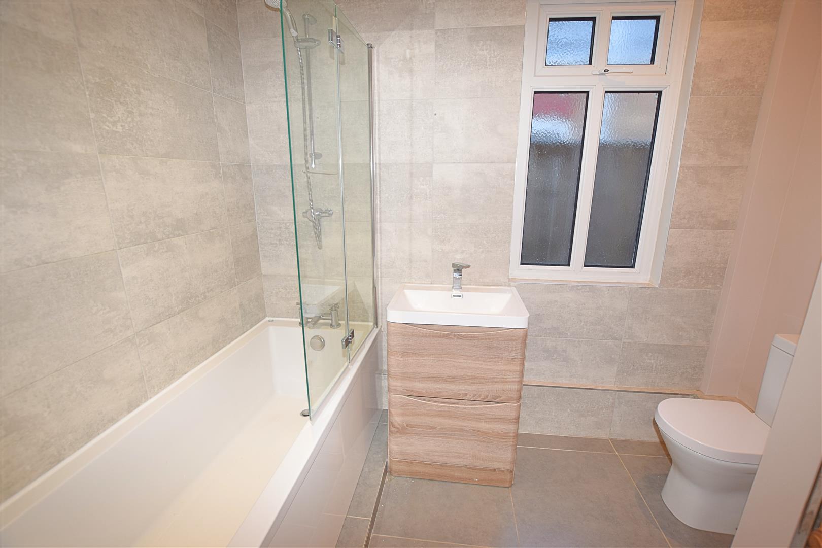 Stylish and modern with white suite comprising encased bath with chrome mixer tap, shower system and glass shower screen. Vanity hand basin in dedicated toiletry surround and low flush WC. Ceramic tiling to walls and floor. Chrome central heating towel radiator. Double glazed window to rear. Recess lights to ceiling.