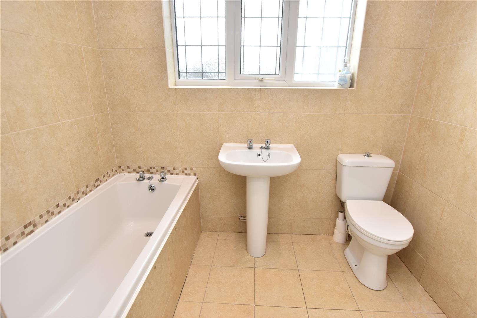 Having a suite in white comprising a panelled bath having a shower and a bi folding screen above, a pedestal wash hand basin and a low flush wc. The walls are fully tiled in a contrasting cermaic tile together with a tiled floor. Heated towel rail. Double glazed window.