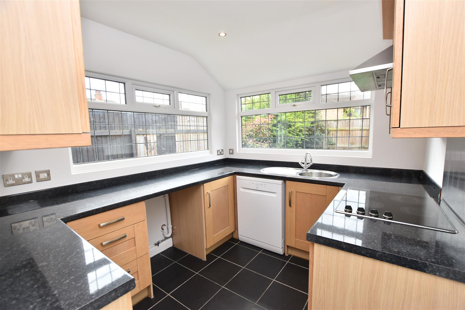 Fitted with a range of modern base and wall cupboards incorporating an electric oven, hob with an extractor chimney above. The contrasting dark work surfaces are inset with a stainless steel sink unit and has space beneath for washing machine. Tiled flooring. Two double glazed windows. Inset spot lights to ceiling.