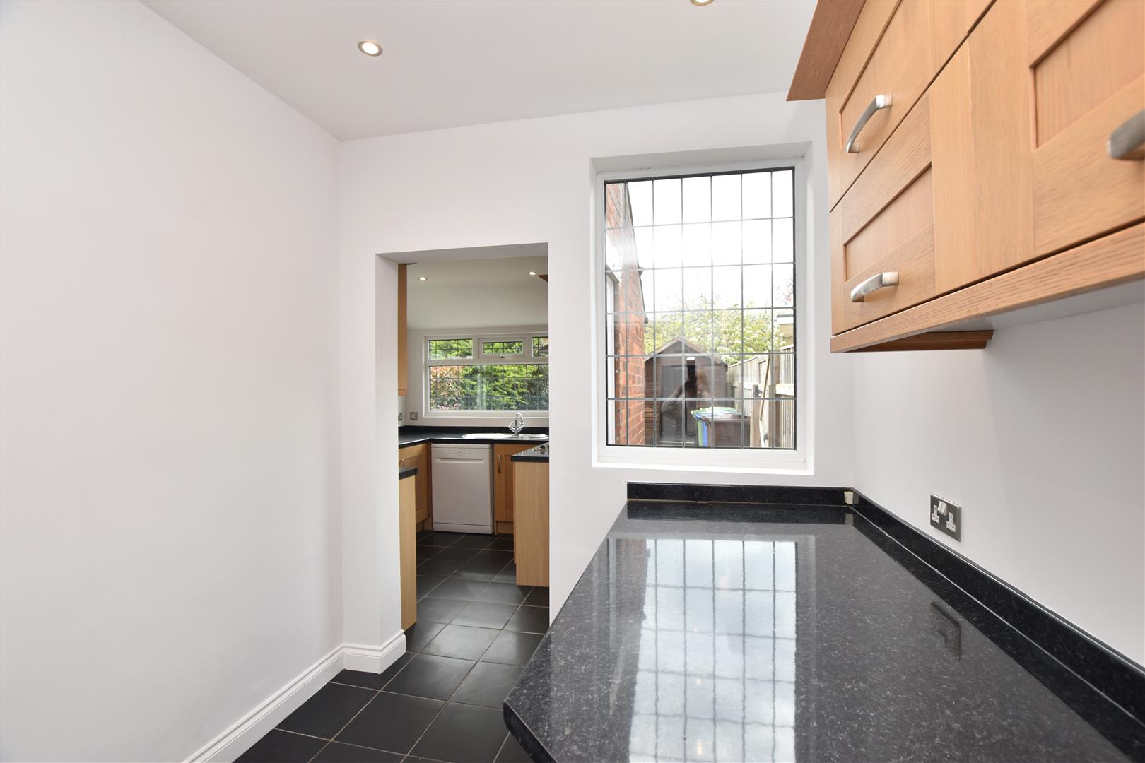 Striking dark tiled floor and being fitted with a large breakfast bar together with radiator and fitted wall cupboards. Inset spot lights to ceiling. Open access leads into:-