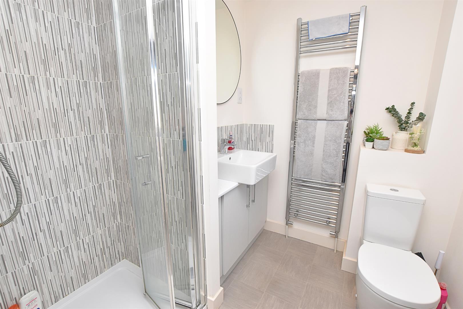 With a suite including a wall in tiled shower cubicle having a bi folding door to the front, a vanity unit including a semi recessed sink with cupboards below and a low flush wc. Heated towel rail. Double glazed window. Vinyl flooring