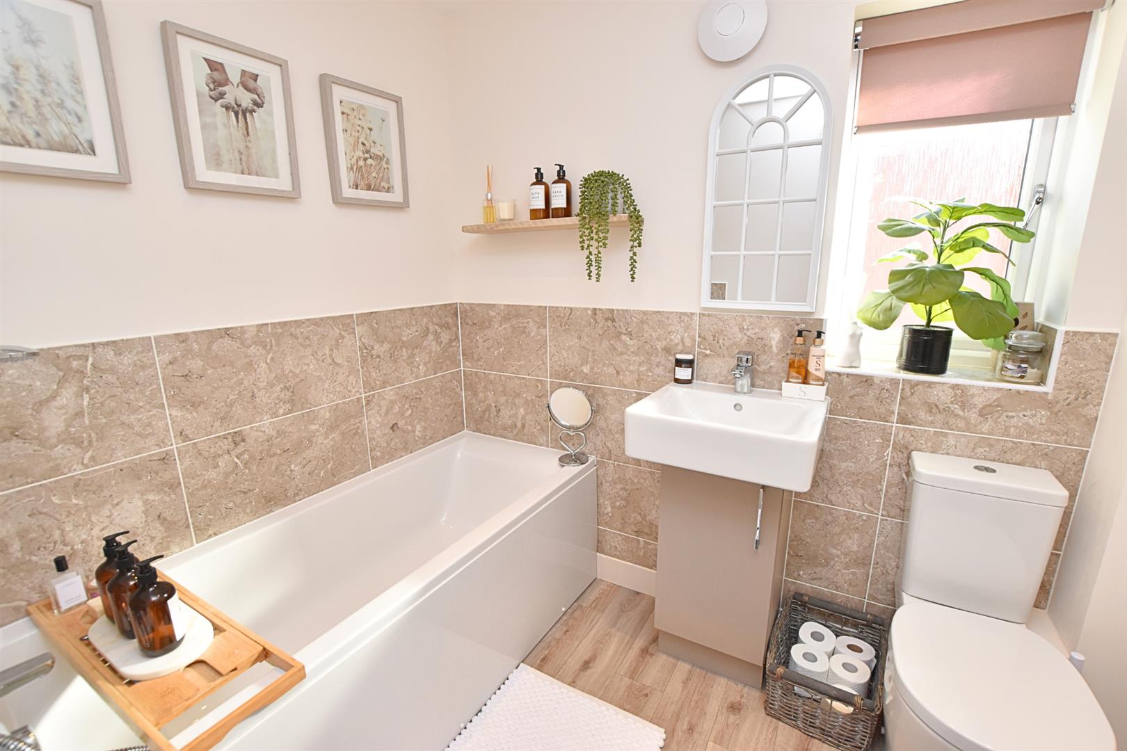Fitted with a suite in white comprising an encased bath including a hand held shower attachment, a vanity unit and a low flush wc. Partial wall tiling to walls. Double glazed window, heated towel rail and vinyl flooring.