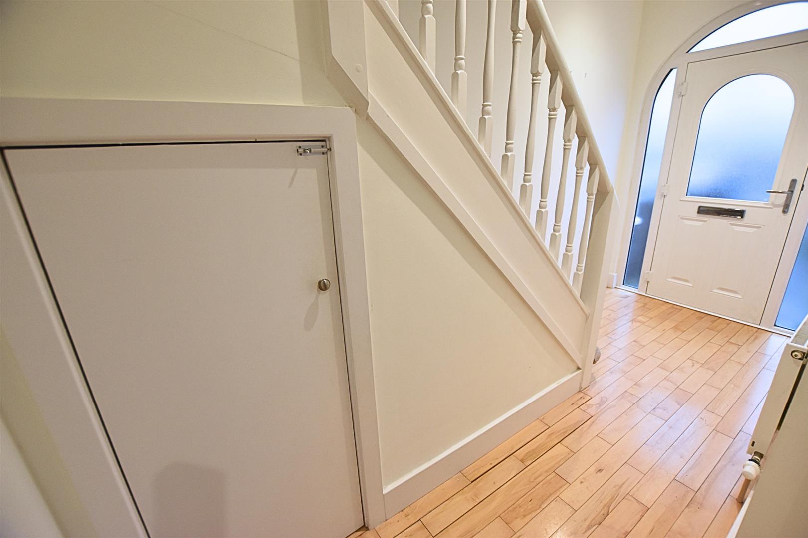 The welcoming hallway has solid wood flooring with carpeted returned stairs case with open white spindle balustrade and handy under stairs storage cupboard. Finished with down lights to the ceiling and radiator.