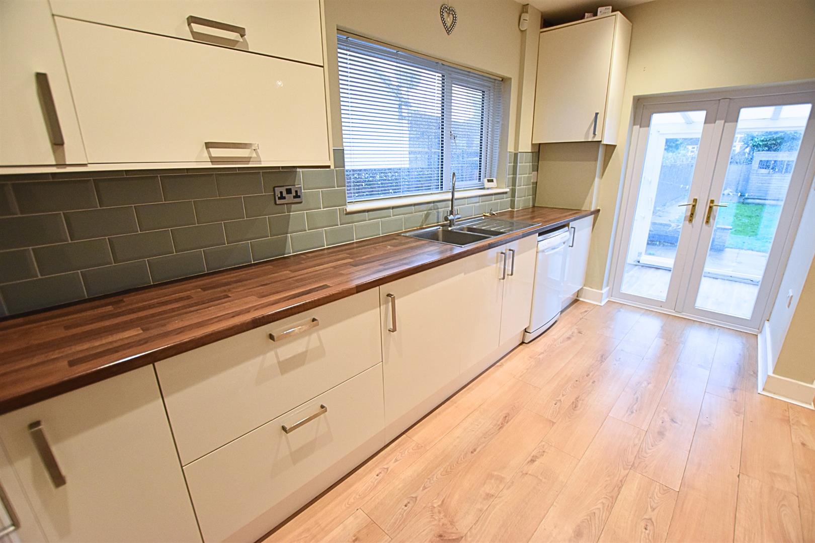 The kitchen benefits from a large range of cream gloss wall and base units with matching pan draws and contrasting wood effect work surfaces, tiled splashbacks and incorporates a stainless steel sink and drainer, electric hob, electric fan assisted oven, glass splash back and stainless steel chimney style extractor hood. Ample space for further appliances and wall mounted boiler in matching unit. Finished with continued wood effect laminate flooring, down lights to the ceiling, uPVC double glazed window to the side aspect and uPVC double glazed French doors leading to the sunroom/utility. Open arch to the sitting dining area.