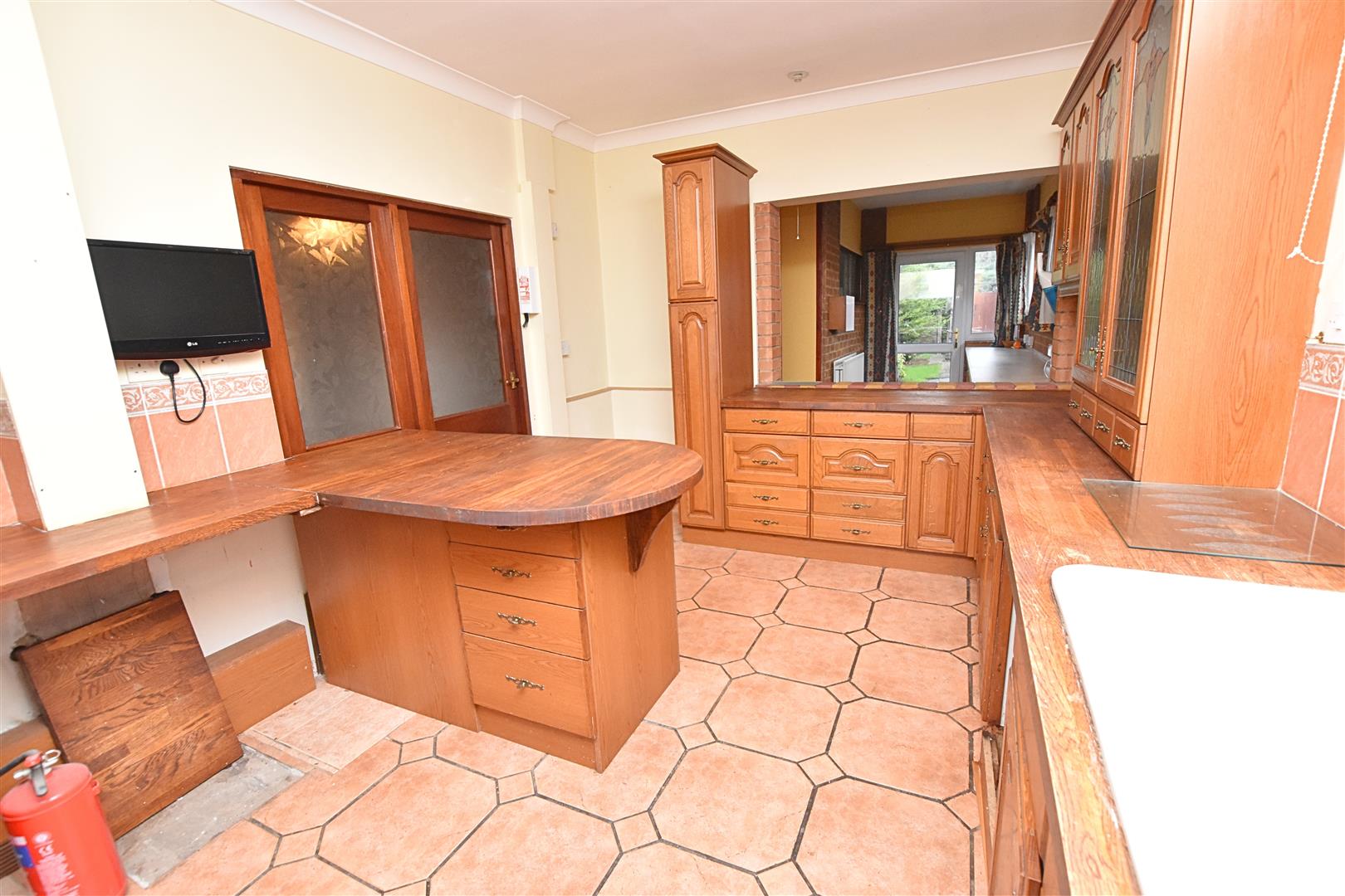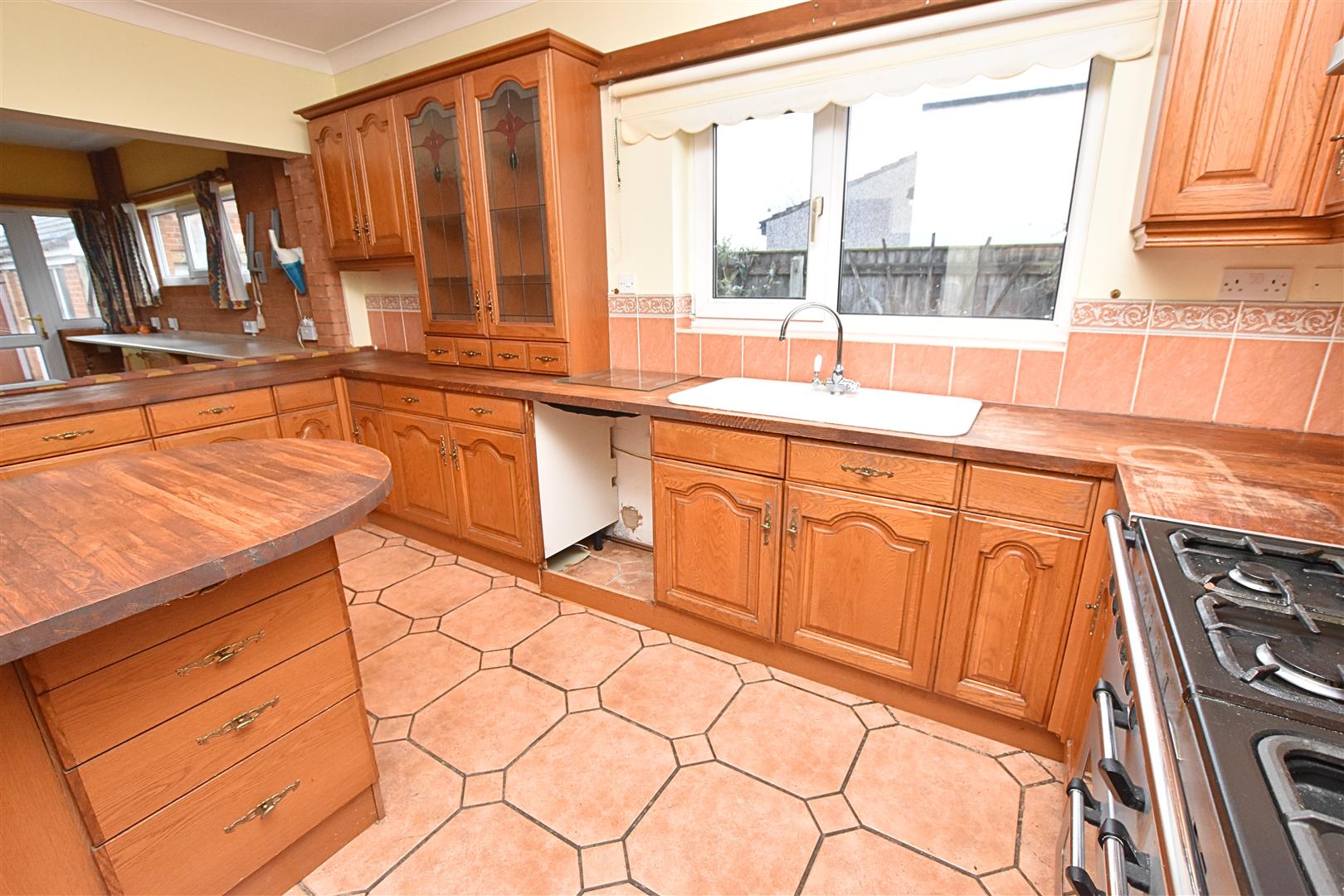 The kitchen benefits from a range of wooden wall and base units with solid wood worksurfaces extending to a breakfast bar area, tiled splash backs and incorporates a ceramic sink and drainer, rangemaster oven and ample space for further appliances. Finished with down lights to the ceiling, tiled flooring, uPVC double glazed window to the side aspect and open wall to the utility room.