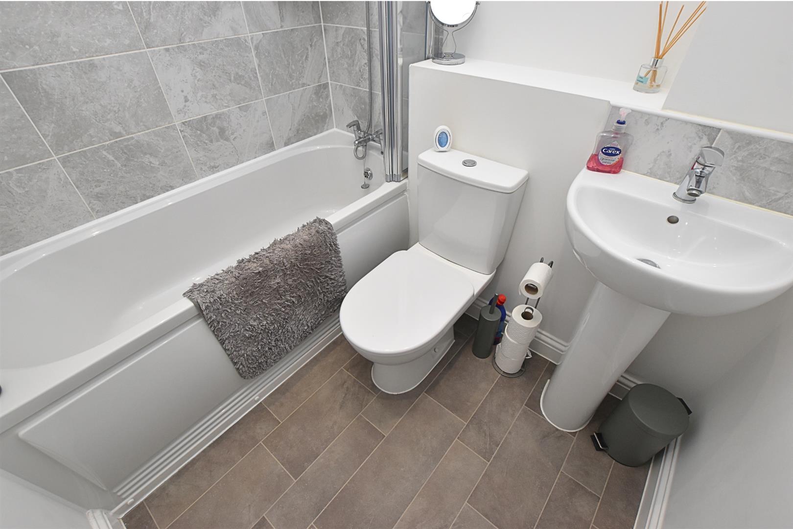 Benefitting from a white three piece suite comprising of; Bath with shower over and glazed screen, pedestal hand wash basin and low flush wc. Finished with tiling to the splashbacks, heated towel rail, down lights, extractor fan and tiled effect vinyl flooring.