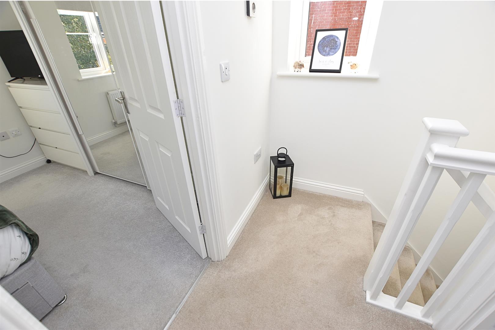 The first floor landing has continued carpeted flooring with white wooden spindle banister and uPVC double glazed window to the side aspect.