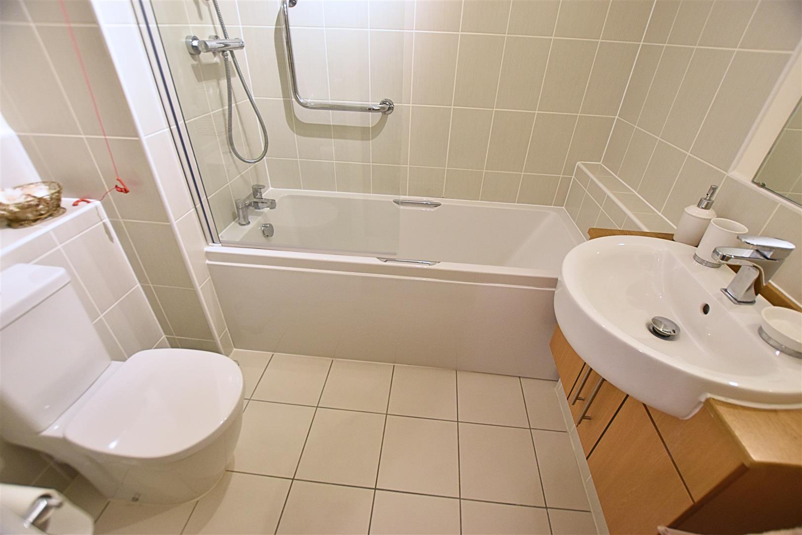 The modern bathroom benefits from a white three piece suite comprising of; Bath with shower over and glazed screen, (the bath can be easily removed as the original shower tray retains underneath) low flush wc and floating hand wash basin set above a wood effect vanity unit. Finished with part tiled walls, tiled flooring, wall mounted mirror, heater, extractor fan and heated towel rail.