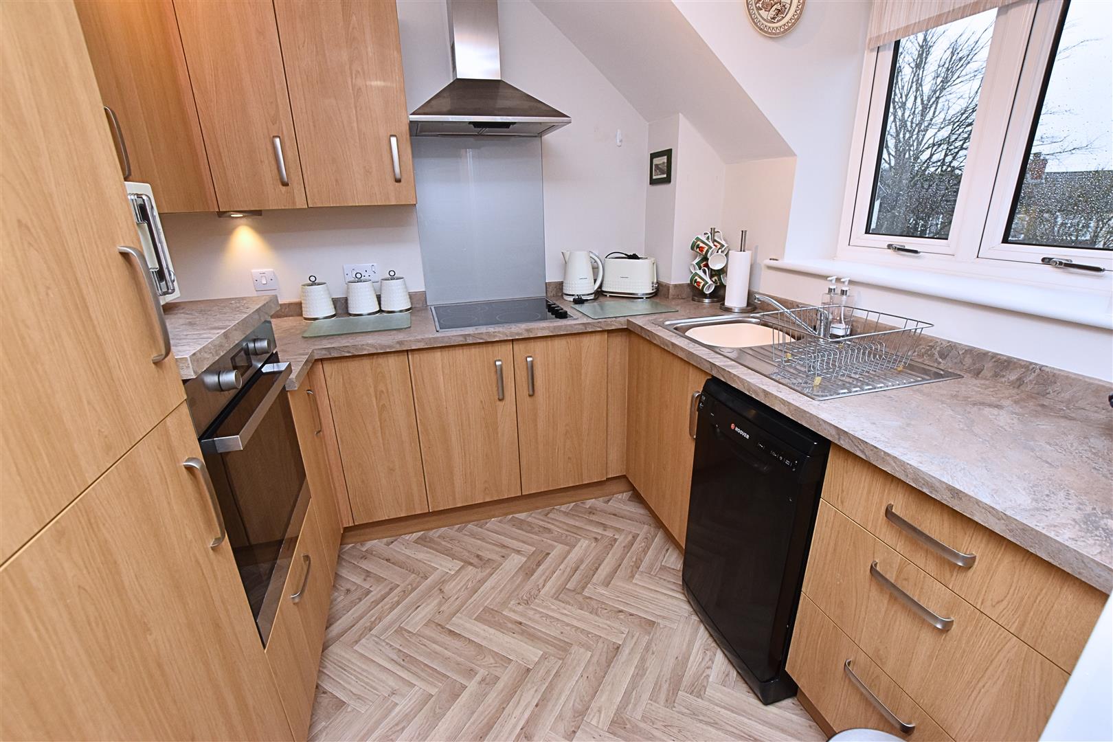 The modern kitchen has been enhanced via the current owner and includes a large range of wood effect wall and base units with contrasting worksurfaces and matching upstands and incorporates a stainless steel sink and drainer, electric fan assisted oven, electric hob with glass splashback and stainless steel chimney style extractor hood above, dishwasher and integrated fridge freezer. Finished with wood effect herringbone style vinyl flooring and uPVC double glazed window to the front aspect.