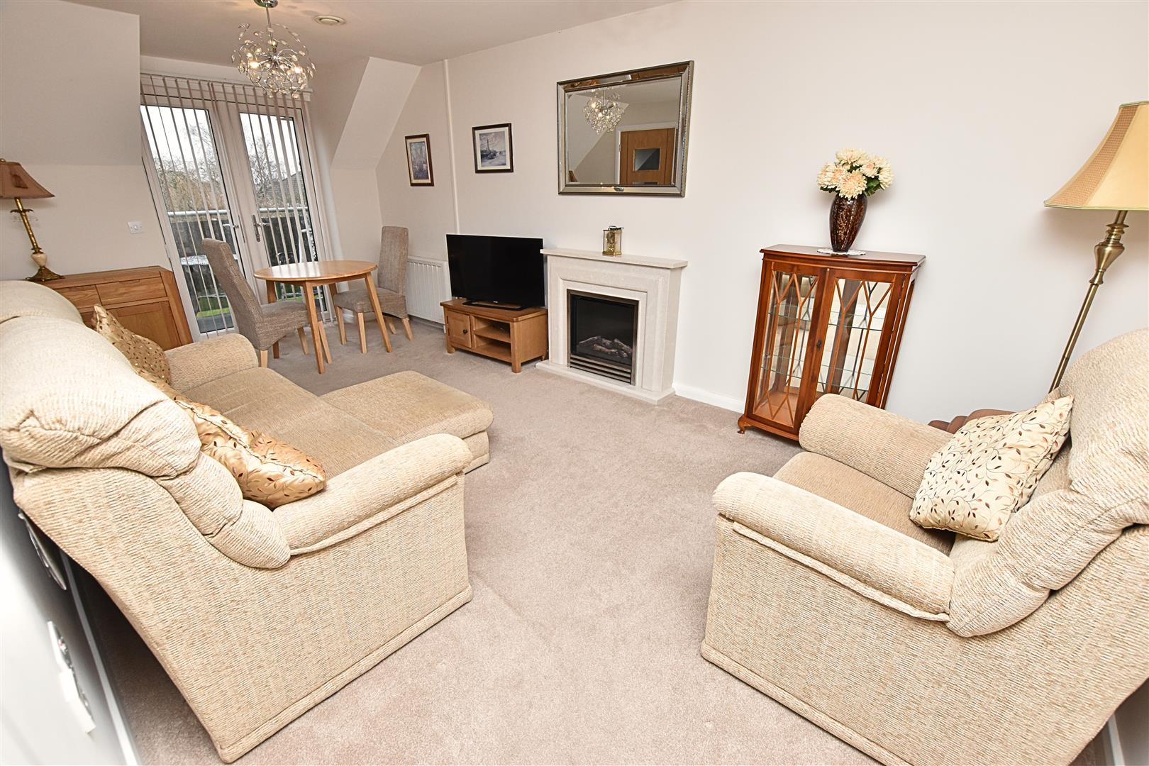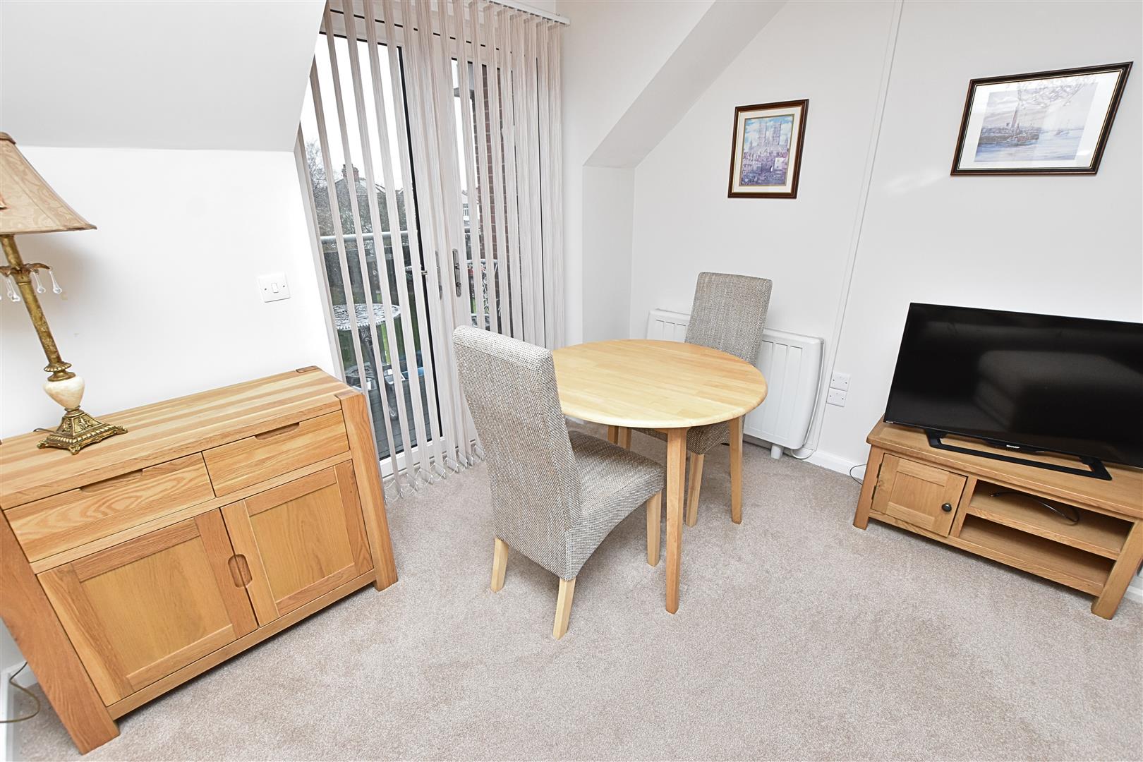 This spacious dual purpose room has ample room for a three piece suite and dining table with uPVC double glazed French doors leading to the walk out Balcony. Finished with carpeted flooring, newly fitted blinds, electric wall heater and a marble fire surround with inset electric fire.
