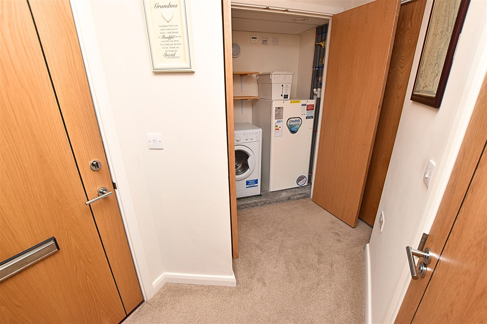 Having carpeted flooring and generous built in cupboard housing the hot water cylinder and washer/dryer and further storage cupboard.