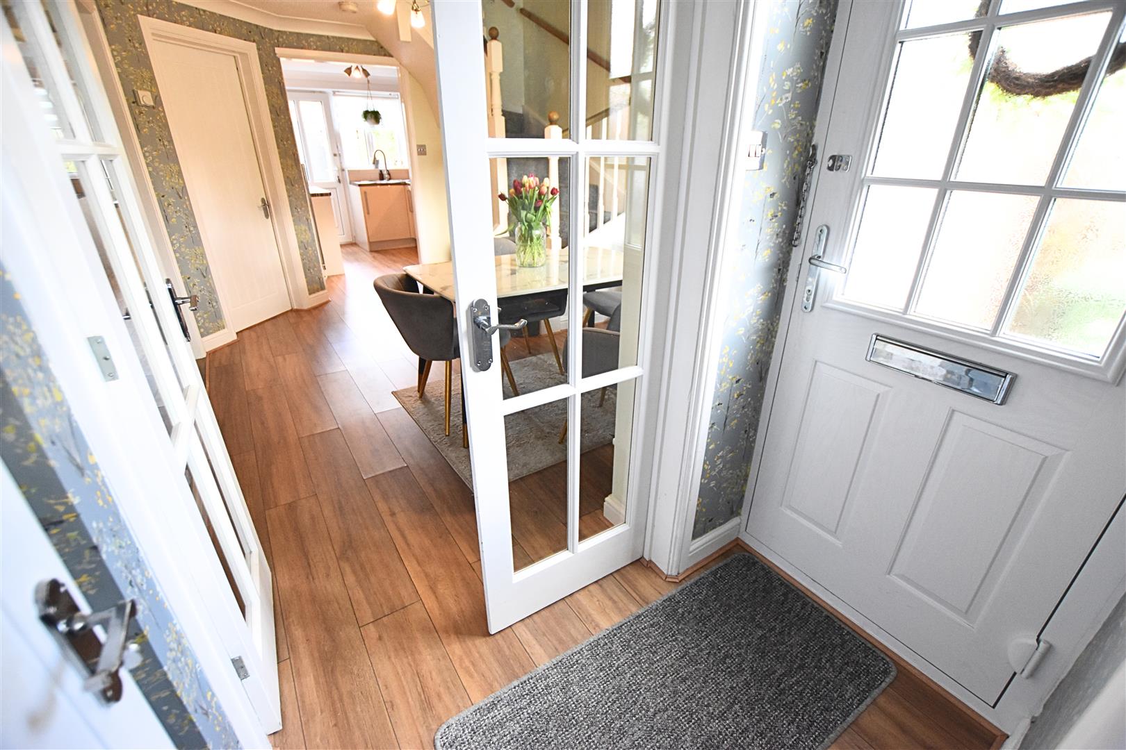 Having wood effect laminate flooring with double wooden doors leading to the dining room.
