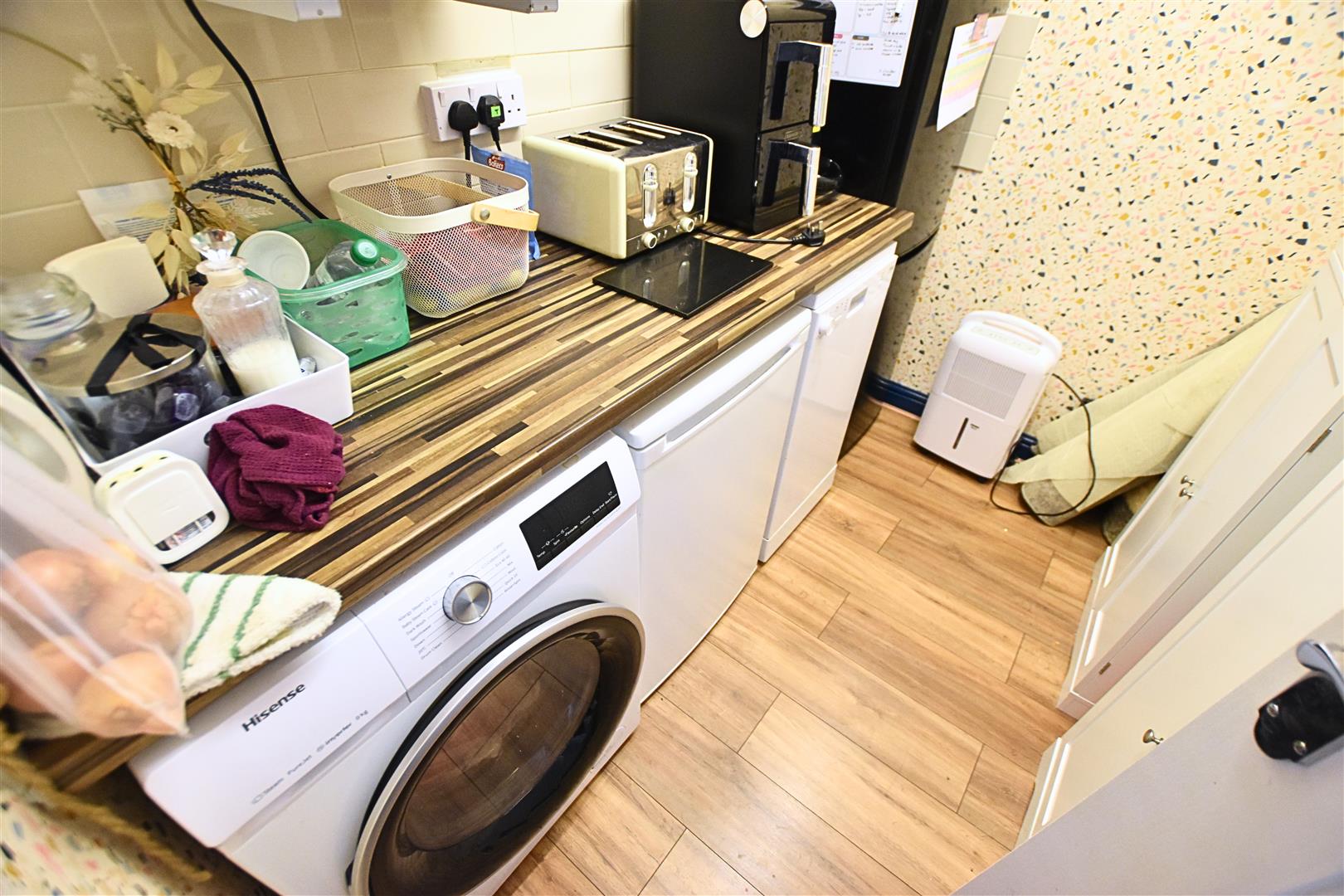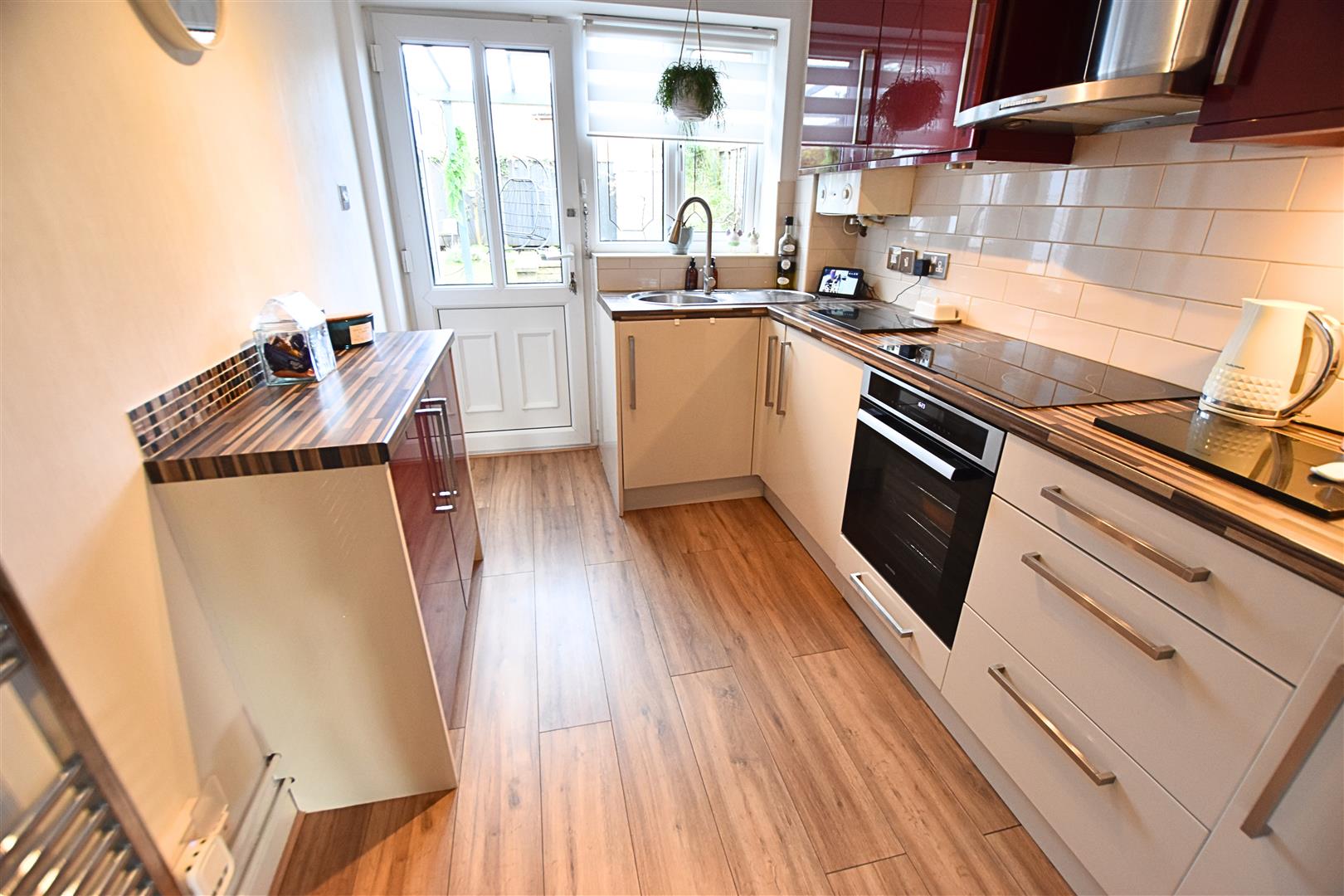 The modern kitchen benefits from a range of cream and purple high gloss wall and base units with wooden effect work surfaces, tiled splashbacks and incorporates a circular stainless steel sink and drainer, ceramic hob with electric fan assisted oven beneath and stainless steel chimney style extractor hood above and integrated fridge. Finished with wood effect laminate flooring, heated towel rail, uPVC double glazed window with night and day blind fitted and a uPVC double glazed door leading to the patio area.