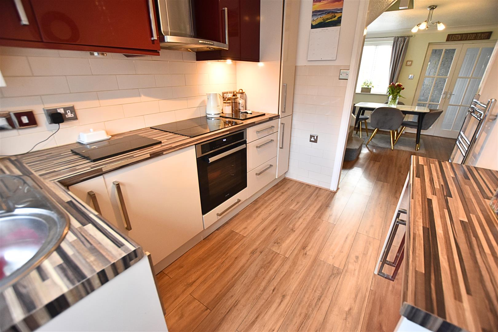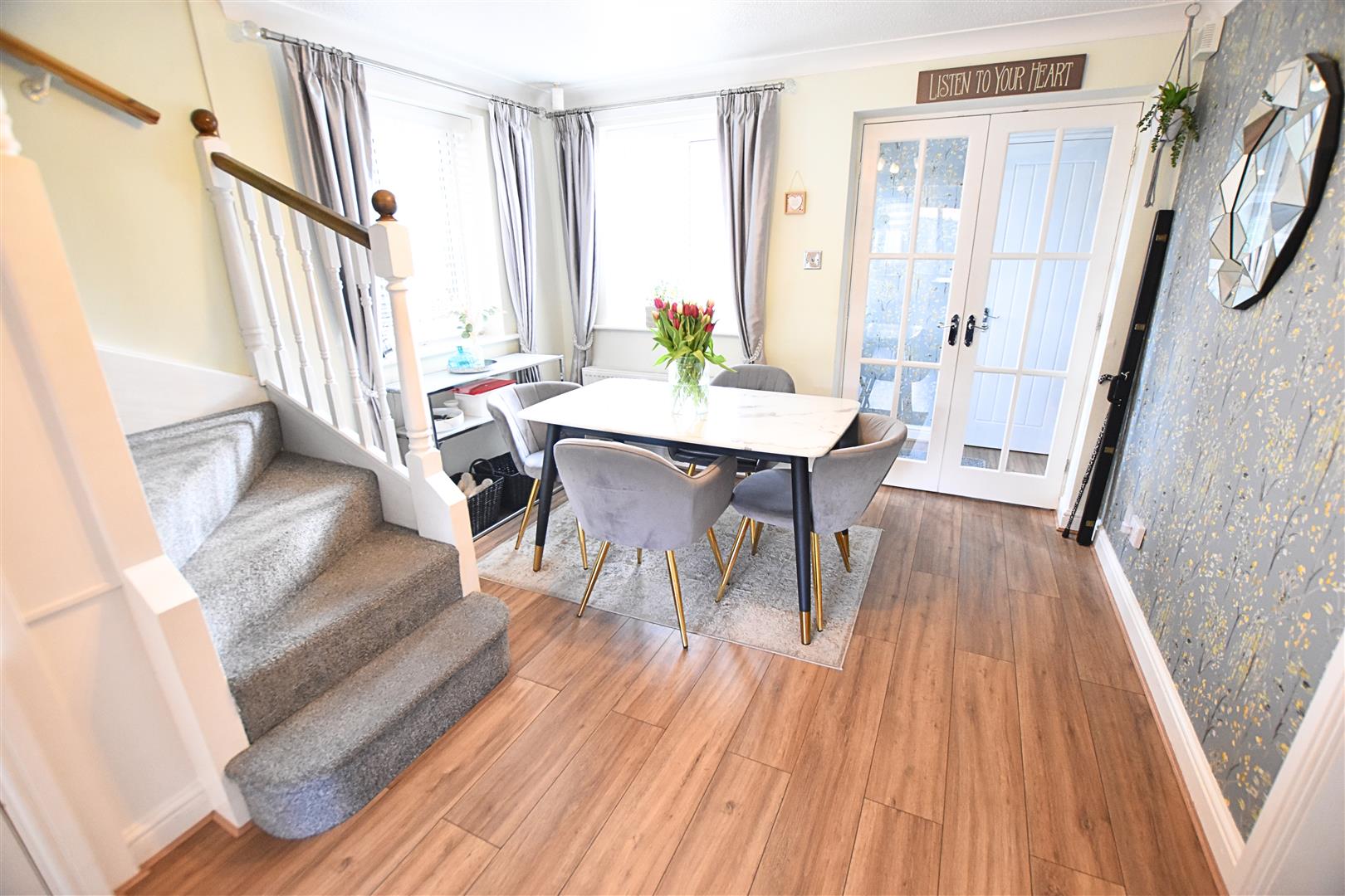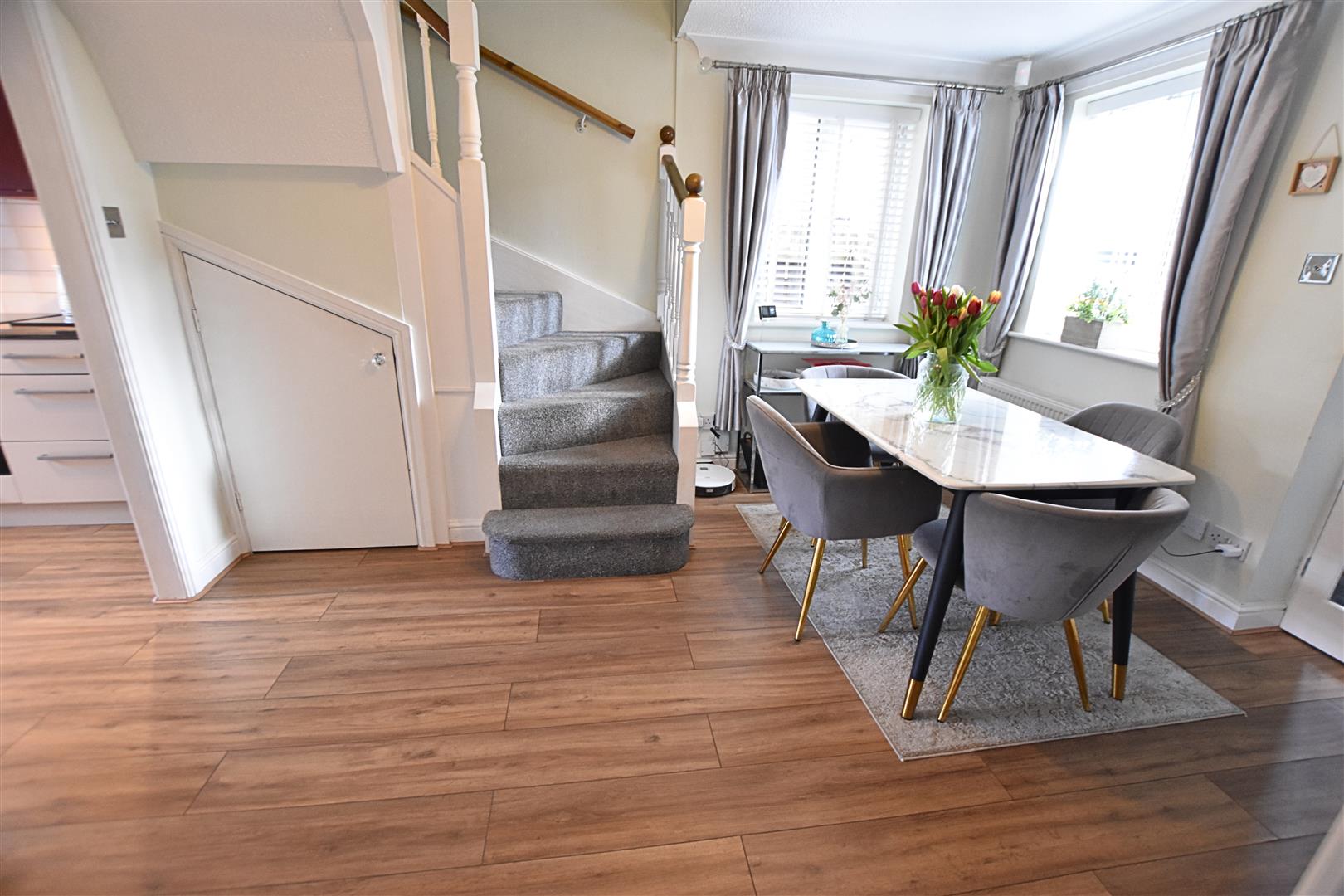 The dining area has dual aspect uPVC double glazed window with modern blinds fitted, wood effect laminate flooring, coving to the ceiling, radiator and return stair case with carpeted treat and white wooden spindle balustrade. Open access to the kitchen.