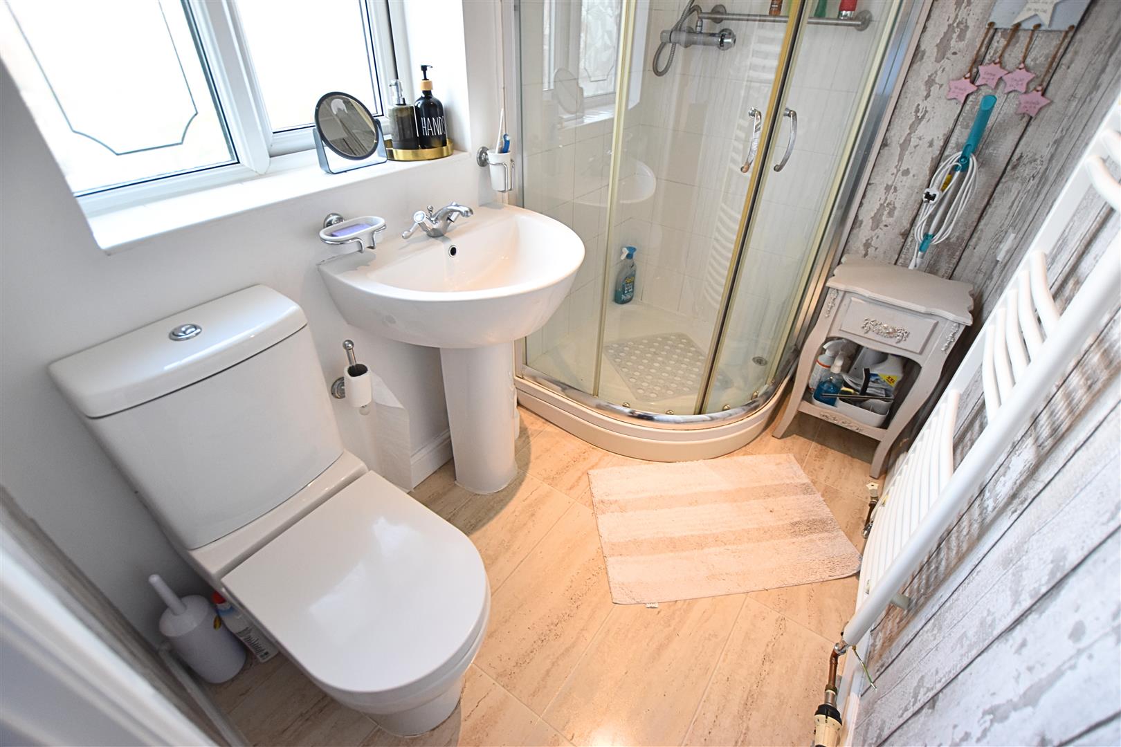 Benefitting from a white three piece suite comprising of; Walk in shower with glazed screens and tiled splashbacks, pedestal hand wash basin and low flush wc. Finished with coving and down lighting to the ceiling, tiled effect flooring, heated towel rail and a uPVC double glazed window to the rear aspect.