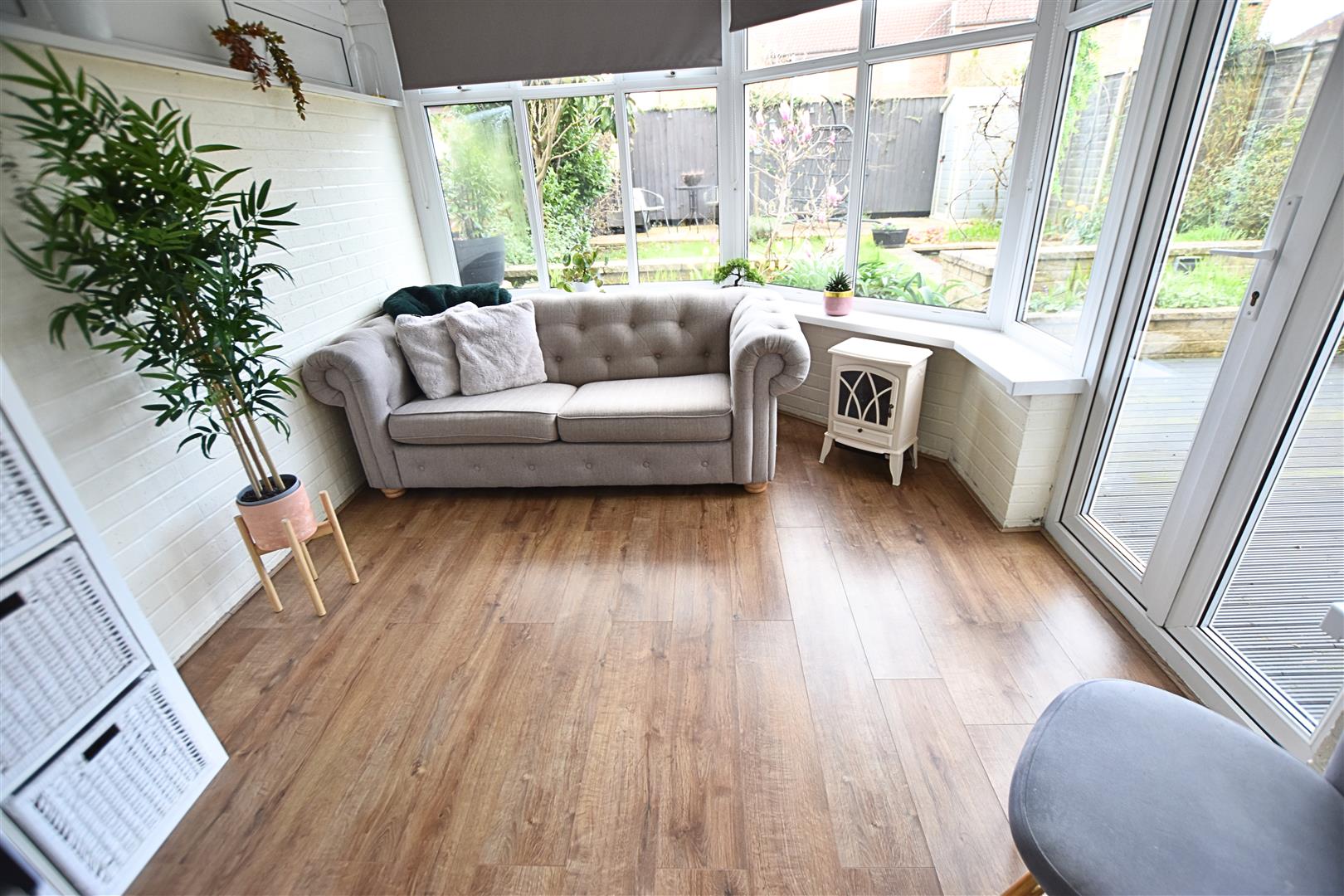 The handy addition has dual aspect uPVC double glazed window with French doors leading to the patio and wood effect lminate flooring.