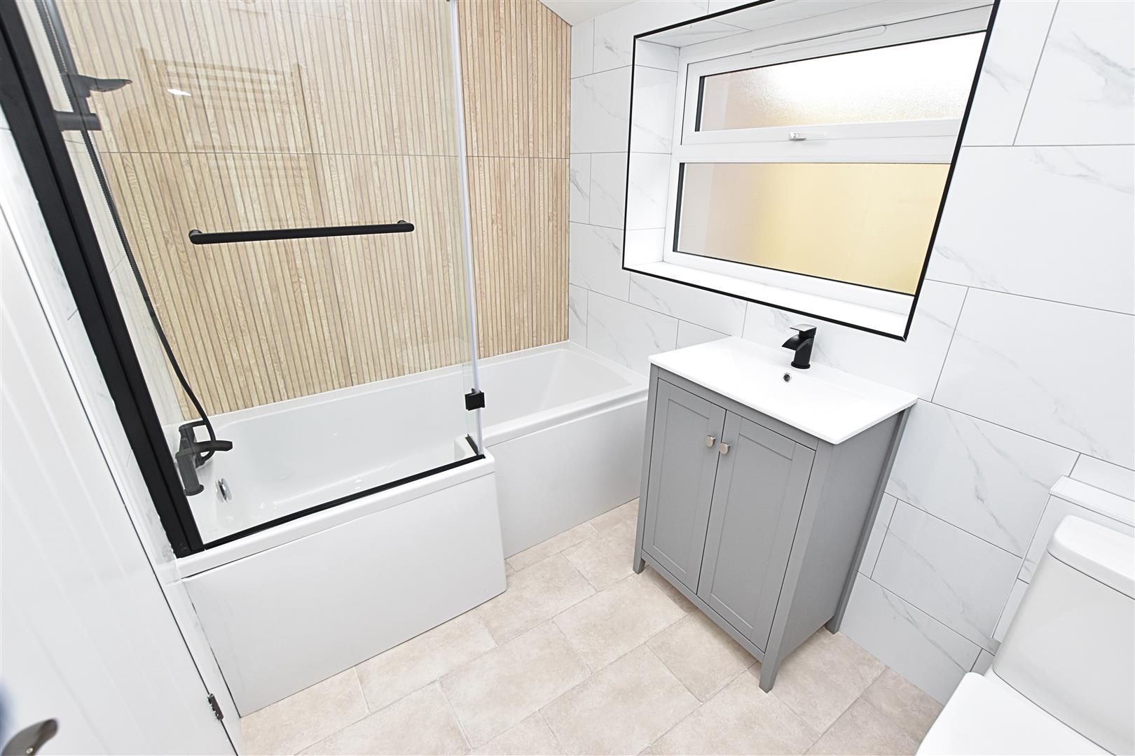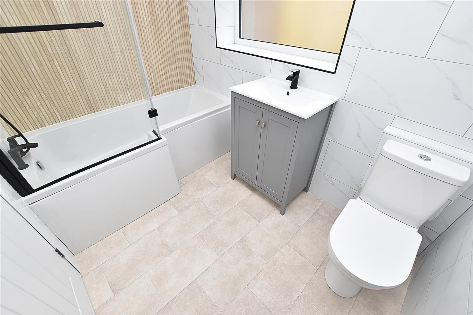 The newly refurbished bathroom benefits from a modern white three piece suite comprising of; L-Shaped bath with shower over and glazed screen all finished with a modern black trim, grey vanity hand wash unit with handy storage and a low flush wc. Finished with modern tiling to the walls, feature panelled effect tiled wall, down lights, black heated towel rail, tiled effect vinyl flooring and a uPVC double glazed window to the rear aspect.