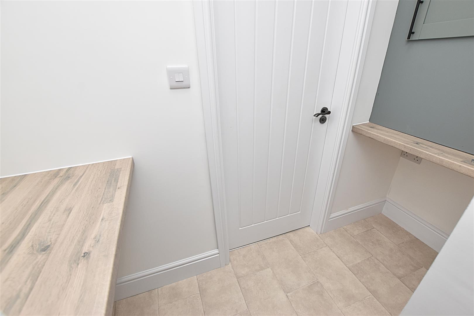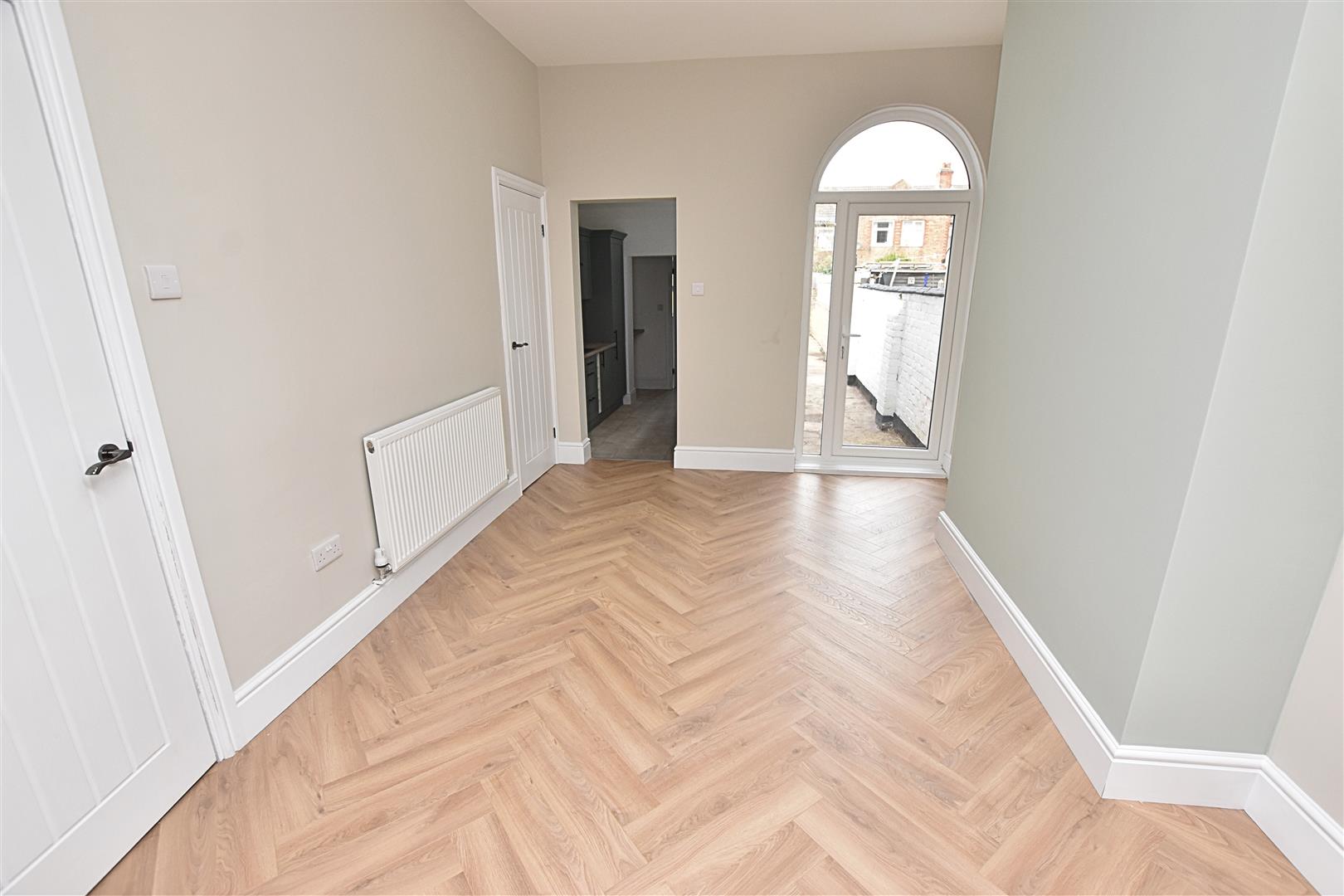 Having newly fitted mat flooring with light and half glazed uPVC double glazed door into the hallway.