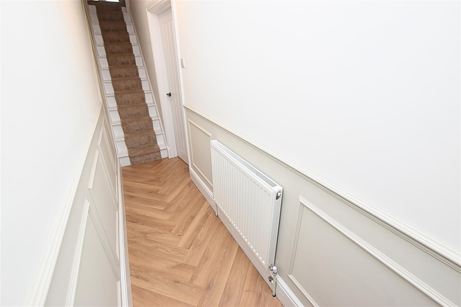The welcoming hallway set the feel for the rest of the property with its modern panelled walls, wood effect Herringbone style flooring, white washed staircase with carpet runner leading to the first floor, radiator and modern white panelled connecting doors.