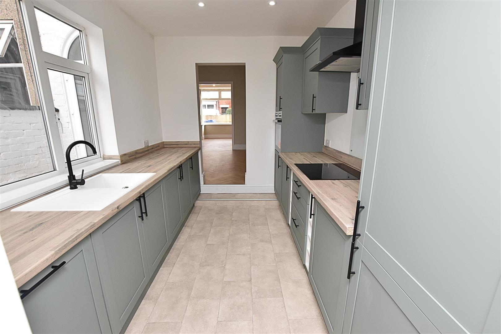 The newly fitted modern kitchen benefits from a large range of shaker style wall and base units in a forest green colour with black handles and modern wood effect worksurfaces with matching up stands incorporating a composite sink and drainer, ceramic hob with glass splashback and black chimney style extractor hood, electric oven, integrated fridge freezer and dishwasher. Finished with down lights to the ceiling, tiled effect vinyl flooring and a uPVC double glazed window to the side aspect.