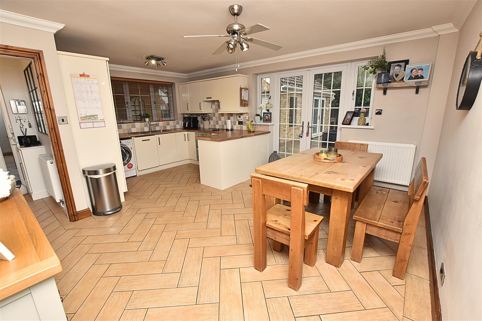 The open plan kitchen diner provides the ideal family space. Benefitting from a large range of cream gloss wall and base units with contrasting wood effect work surfaces and tiled splashbacks. Incorporating a stainless steel sink and drainer with ceramic hob, electric fan assisted oven and extractor hood. Integrated appliances include dishwasher, automatic washing machine, fridge freezer and wine cooler. Open to the dining area with wood effect tiled flooring, radiator, coving to the ceiling, uPVC double glazed window to the side aspect with modern fitted blinds and uPVC double glazed French doors with side light windows overlooking the rear garden. Large understairs cloaks cupboard providing handy storage.