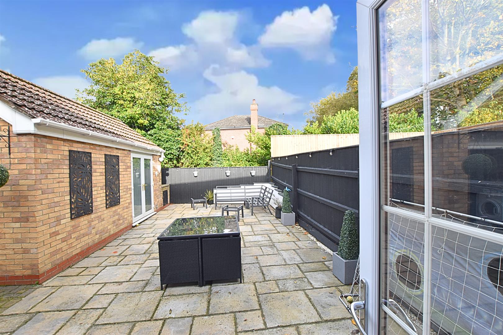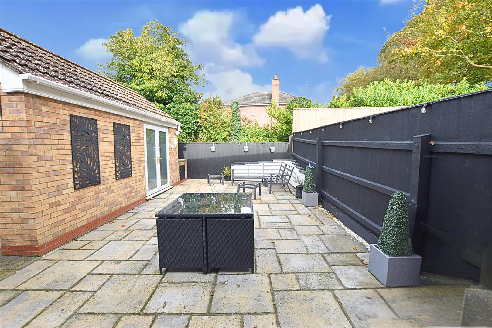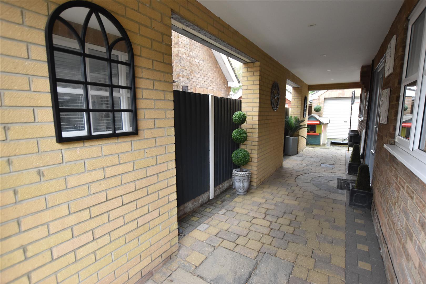 The property sits behind double gates with fenced boundaries and is paved for low maintenance, providing ample off road. Mature planting to the borders. The side driveway extends under the property and leads to the detached garage and private rear garden. The private rear garden has fenced boundaries and is paved for low maintenance creating an ideal outside entertaining area. Oil tank to the rear of the garage.