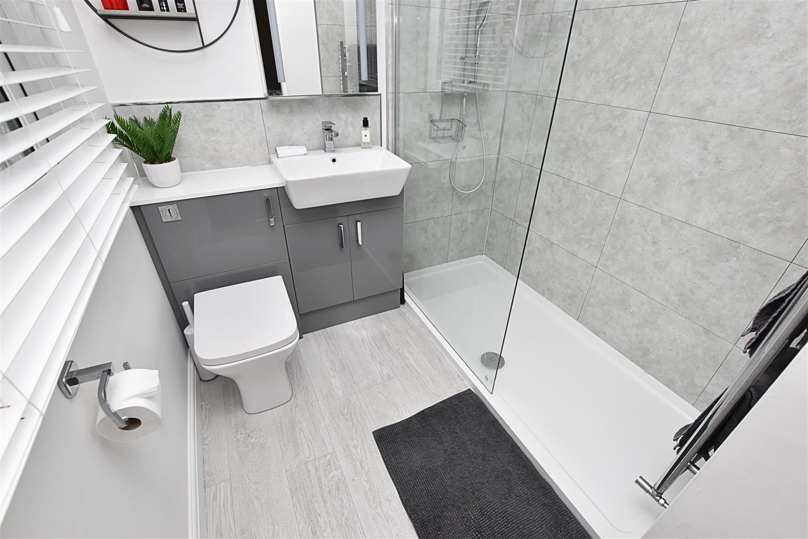 Benefitting from a modern white three piece suite comprising of; Walk in shower with rainfall head and glazed screen, modern grey combination unit housing the hand wash basin and low flush wc with hidden cistern. Finished with modern tiling to the splashback areas, down lights, extractor fan, steam free mirror, heated towel rail, wood effect laminate flooring and a uPVC double glazed window to the front aspect.