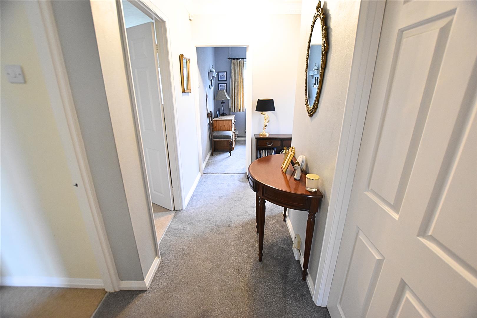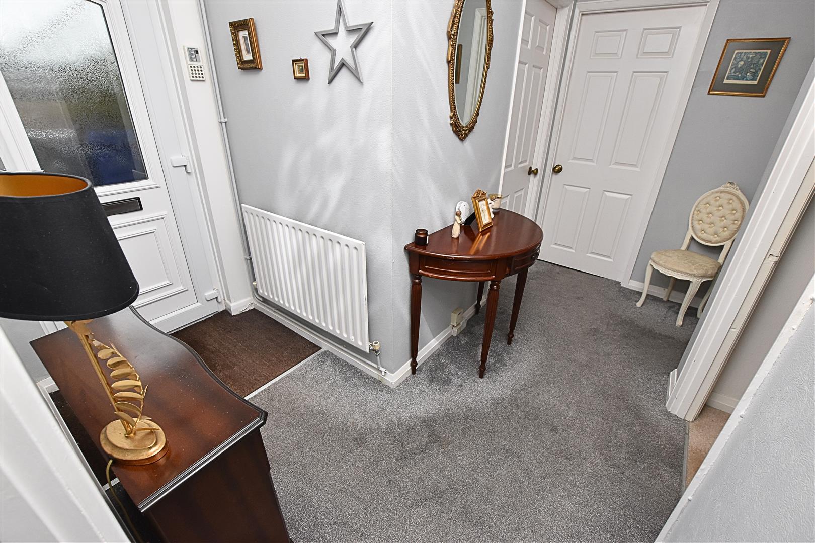 The welcoming hallway has coving to the ceiling, carpeted flooring and radiator.