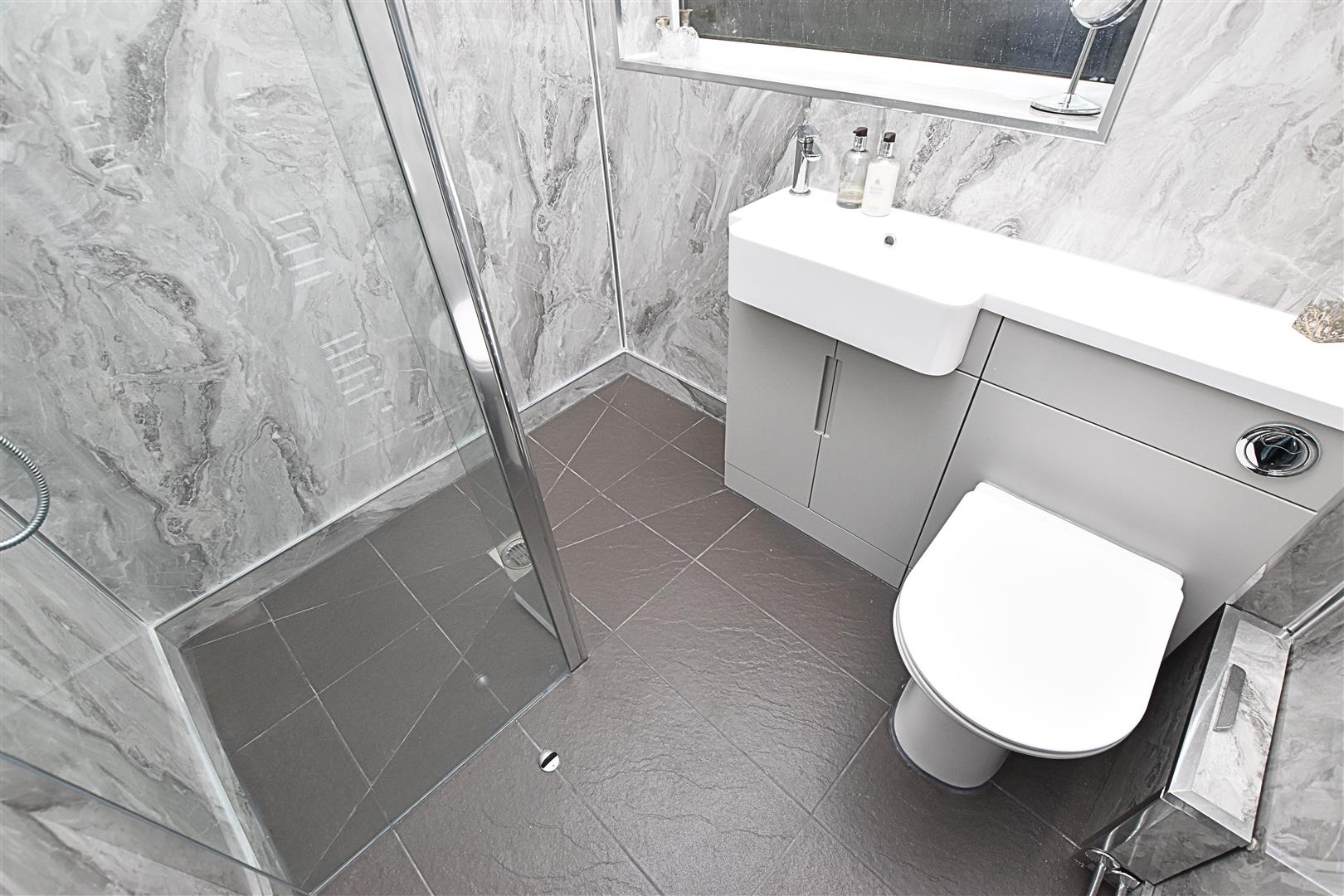 The modern shower/wet room benefits from a three piece suite comprising of; walk in in shower with dual head one being rainfall and glazed screen, grey gloss combination unit housing the hand wash basin and low flush wc with hidden cistern. Finished with aqua style paneling to the walls, tiled flooring, down lights to the ceiling, heated towel rail and a uPVC double glazed window to the side aspect.