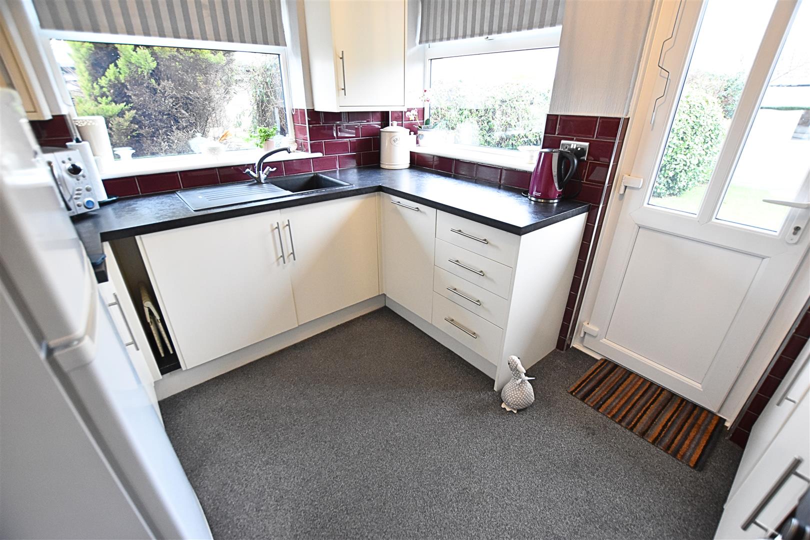 The modern kitchen benefits from a range of cream gloss wall and base units with contrasting work surfaces and tiled splash backs and incorporates a composite sink and drainer, ceramic hob with black chimney style extractor hood above and electric fan assisted oven beneath, integrated dishwasher and automatic washing machine with ample space for a freestanding fridge freezer. Finished with dual aspect uPVC double glazed windows and uPVC door leading to the rear garden, and carpeted flooring.