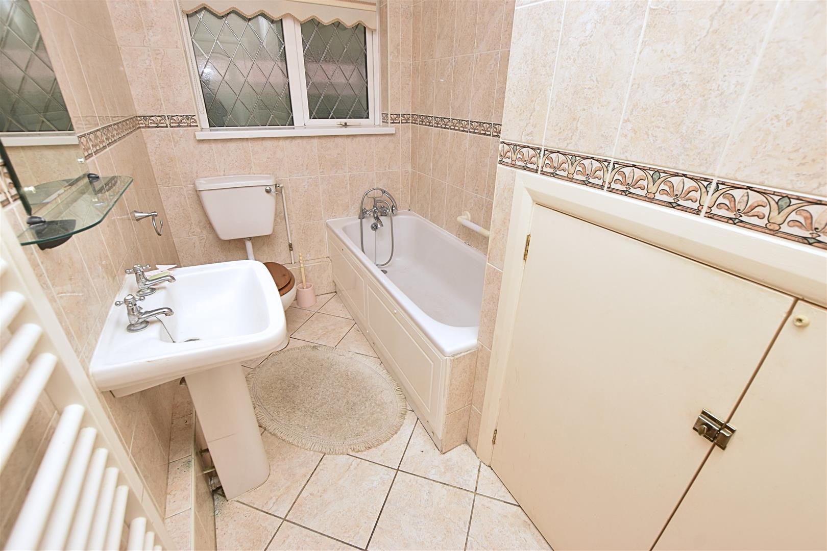 Benefitting from a white three piece suite comprising of; Bath with hand shower attachment, pedestal hand wash basin and wc. Finished with fully tiled walls and floor, heated towel rail, handy storage cupboard and uPVC double glazed window to the rear aspect.
