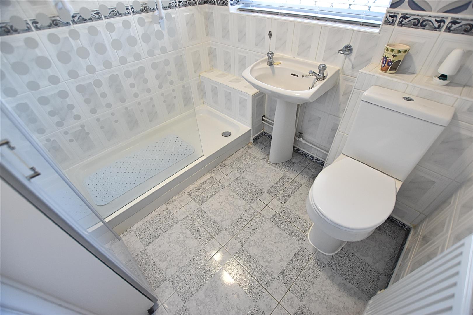 The shower room benefits from a white three piece suite comprising of; Walk in shower with glazed screen, pedestal hand wash basin and low flush wc. Finished with tiled walls, wood effect vinyl flooring, radiator and uPVC double glazed window to the rear aspect.
