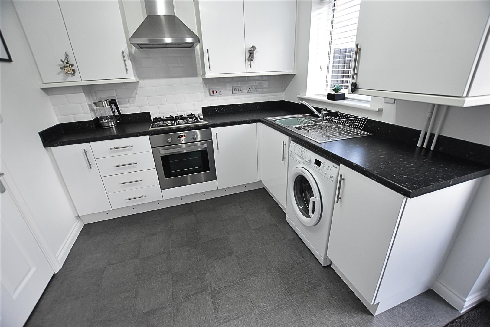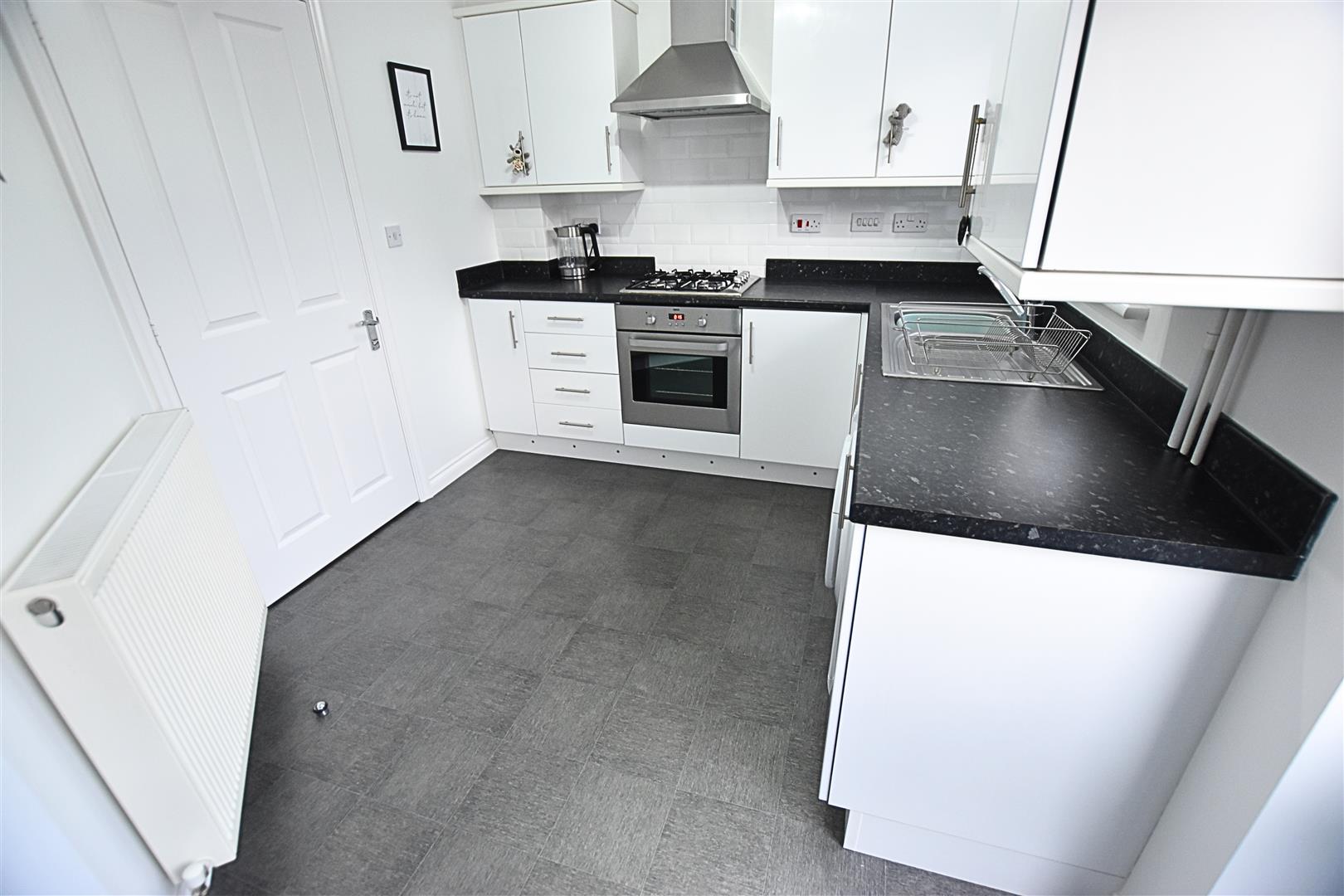 The kitchen benefits from a large range of wall and base units in white high gloss with contrasting work surfaces, matching upstands and tiled splash backs incorporating a stainless steel sink and drainer, gas hob with stainless steel chimney style extractor hood and electric fan assisted oven beneath, space for a freestanding fridge freezer and automatic washing machine. Extended work surface creating a handy breakfast bar area. Finished with tiled effect vinyl flooring, radiator, wall mounted boiler in matching unit, uPVC double glazed window and door overlooking the rear garden.
