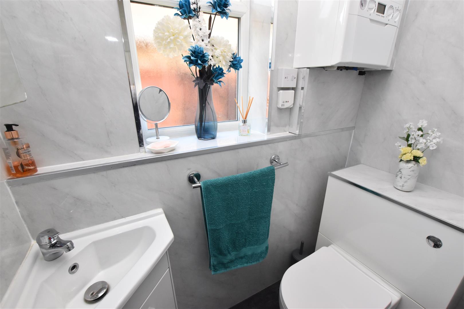 Being fitted with a concealed wc and a corner vanity unit. Wall mounted modern Ideal gas fired boiler, double glazed widow together with waterproof wall boarding and a dark laminate floor.