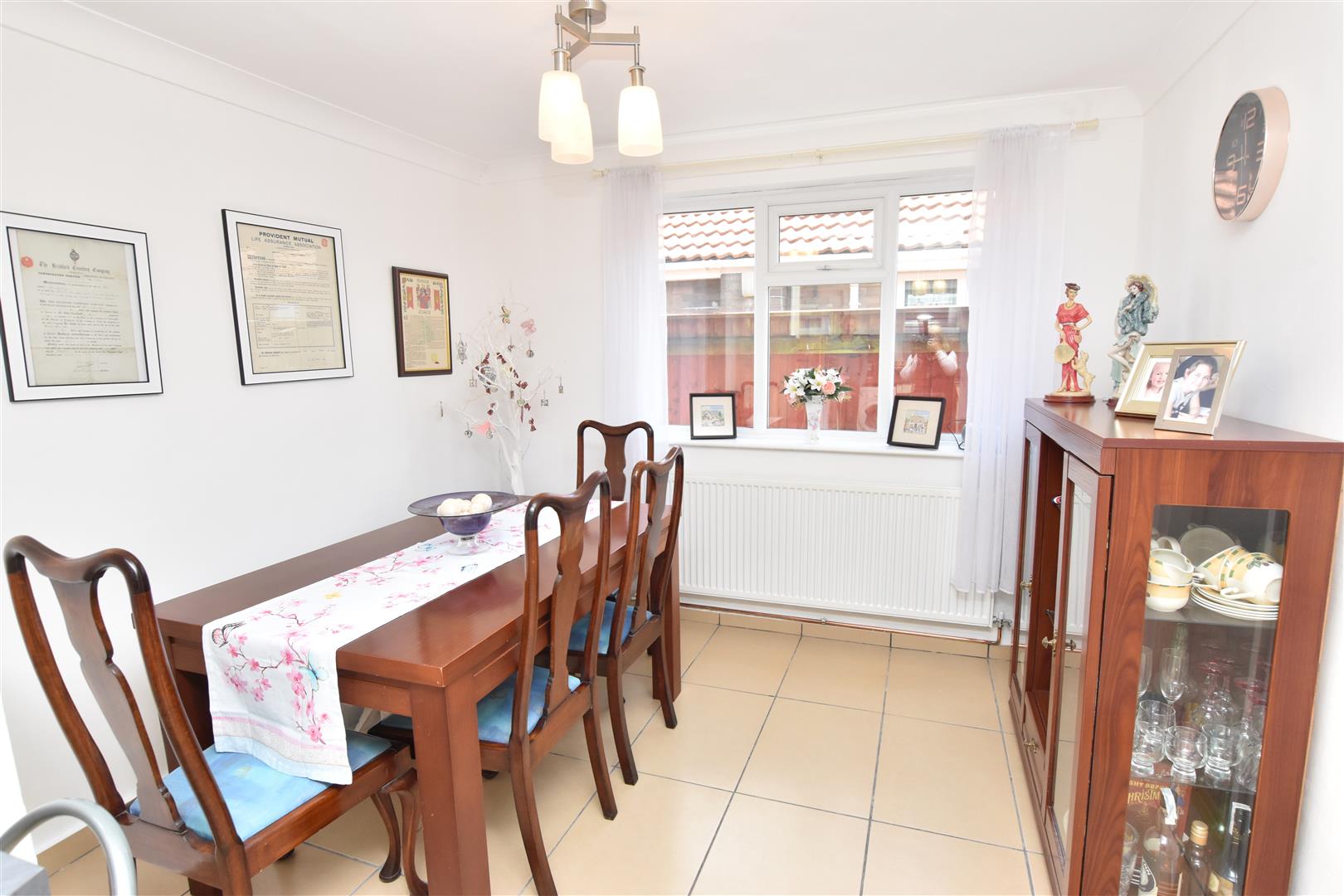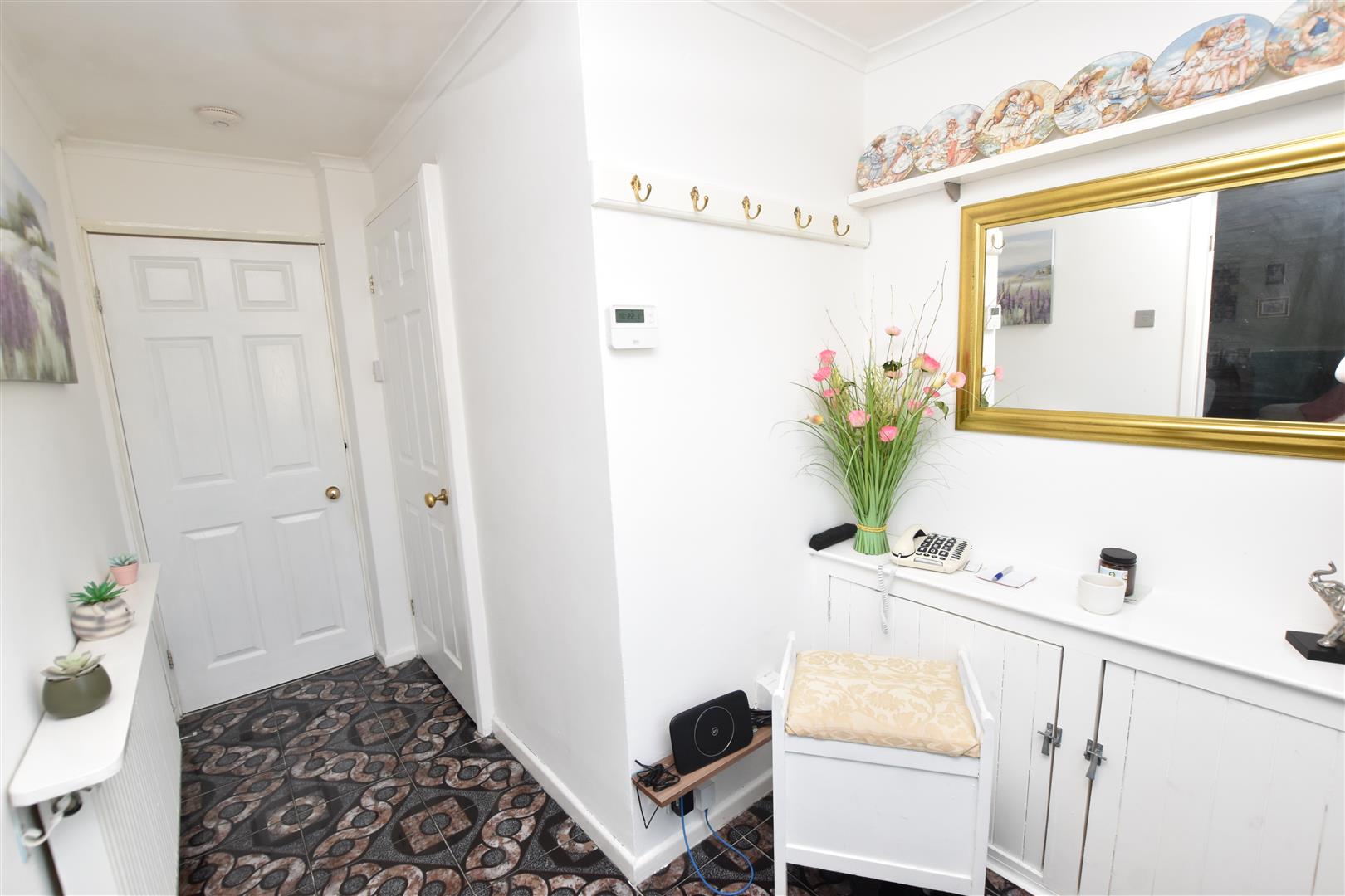 Approached via a modern white composite entrance door with double glazed side lights, this entrance hall has a striking patterned tiled floor, radiator, coving to ceiling and fitted cupboard with louvered doors.