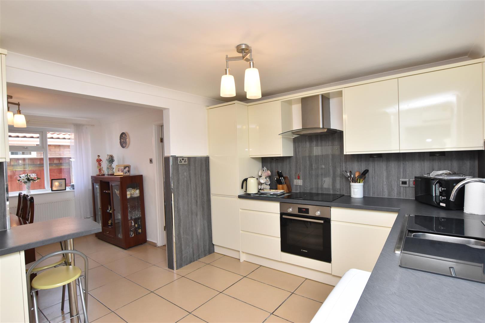 The kitchen area is fitted with a superb range of cream high gloss base and wall cupboards incorporated an integrated dishwasher plus a built in electric oven, an induction hob having a stainless steel extractor fan above. The contrasting dark work surfaces are inset with a resin sink unit having grey mottled waterproof boarding above. Tiled flooring. Double glazed window and door which leads into the utility area.