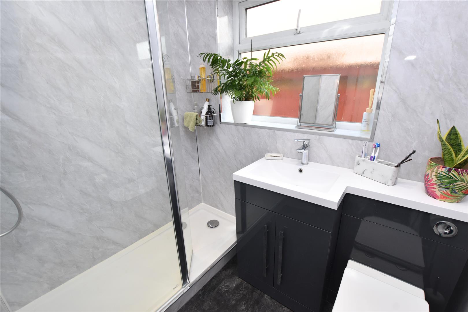 This stylish shower room is fitted with a shower cubicle having twin shower heads and a glass screen plus a dark grey vanity unit comprising a concealed wc and a semi recessed sink having cupboards below. The walls are finished in a complementary grey waterproof wall boarding. Grey vertical radiator. Double glazed windows. Inset spot lights to ceiling. Laminate flooring.