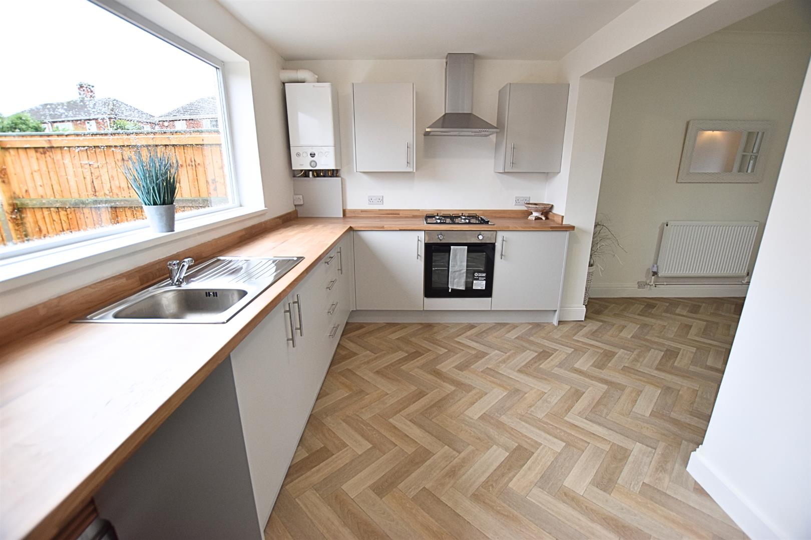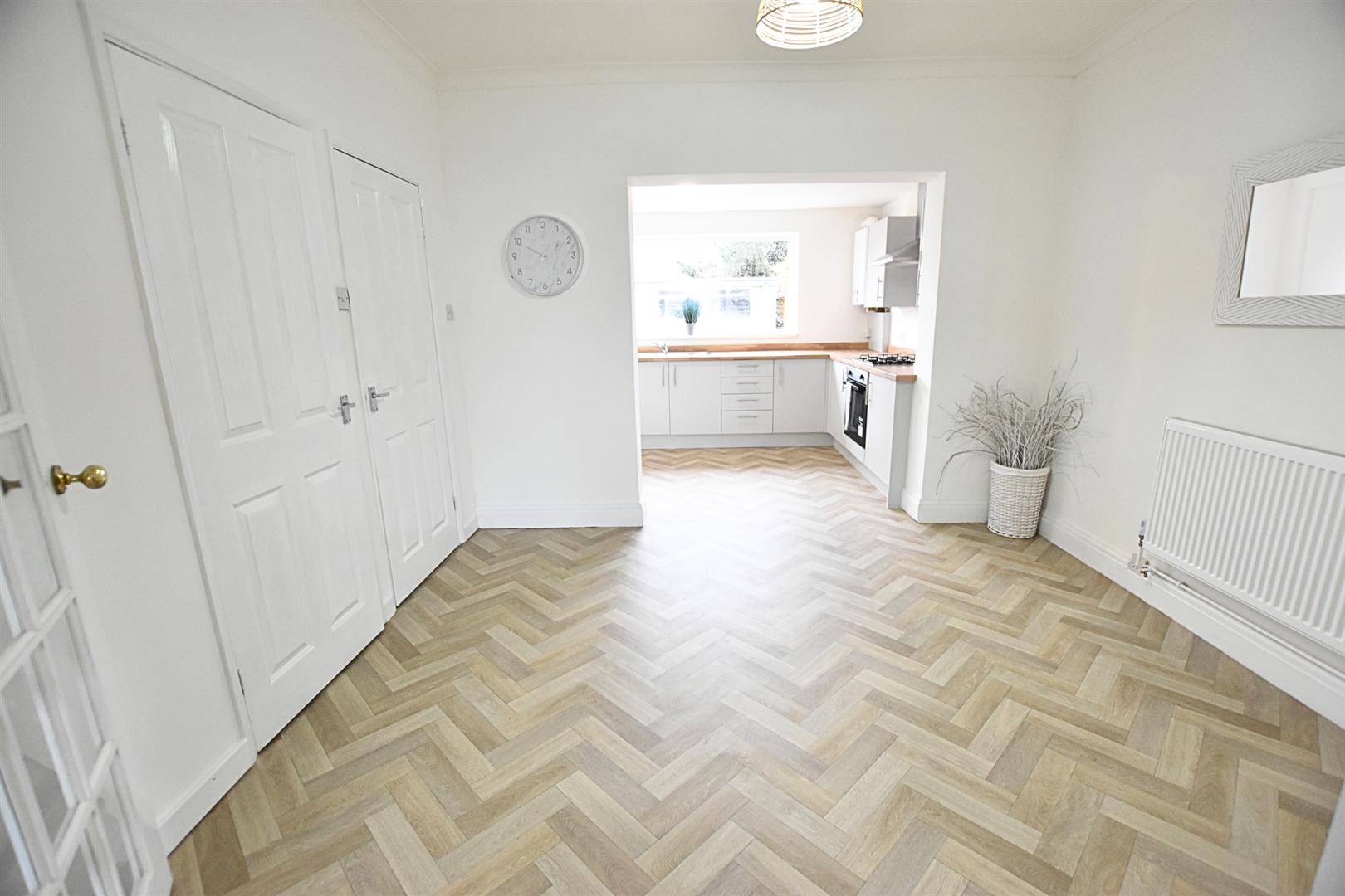 The newly kitchen fitted modern kitchen benefits from a range of duck grey wall and base units with contrasting wood effect worksurfaces with matching upstands incorporating a stainless steel sink and drainer, gas hob with electric fan assisted oven and stainless steel chimney style extractor hood with ample space for an automatic washing machine and freestanding fridge freezer. Finished with Herringbone style vinyl flooring, radiator, uPVC double glazed window over looking the garden and side uPVC door. Open to the dining room creating a fantastic sized room.