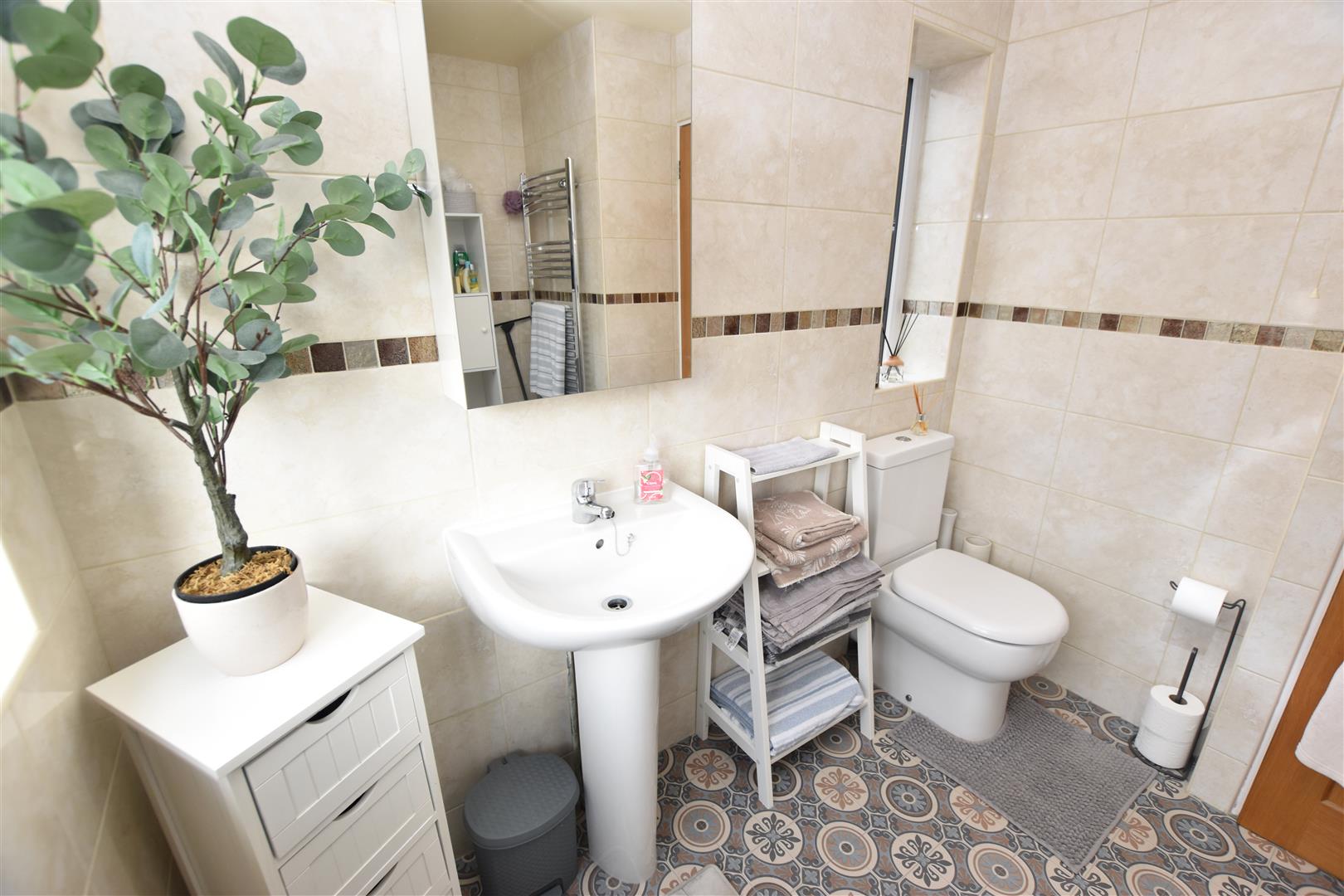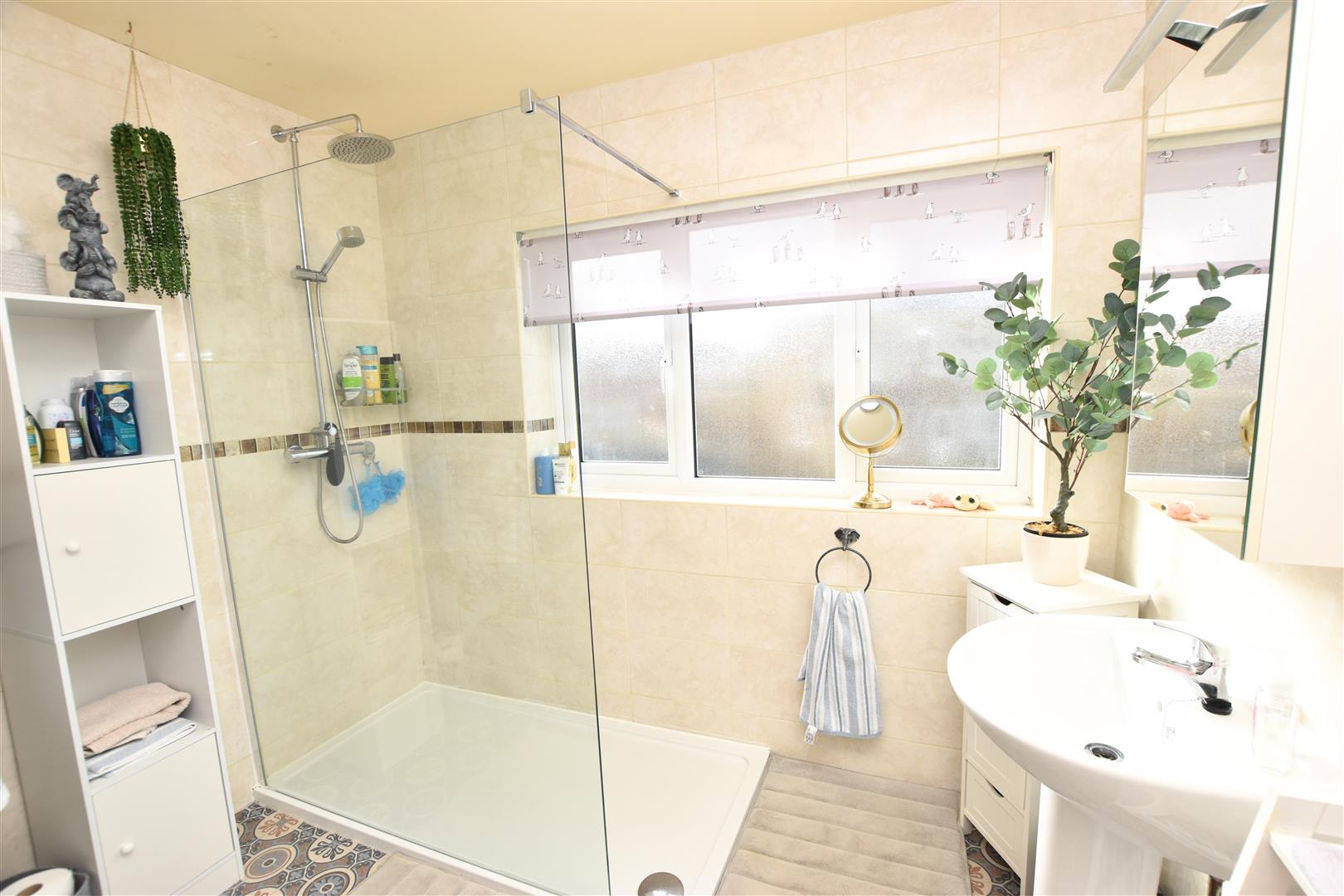 This spacious contemporary styled shower room is fitted with a large walk in shower area having a twin headed shower and a glass screen to the front, a pedestal wash hand basin and a low flush wc,. Heated towel rail. Two double glazed windows. The walls are fully tiled having a striking tiled to dado height. Vinyl flooring.
